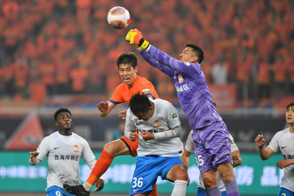 9月13日,青島西海岸隊守門員石笑天(右二)在比賽中防守。新華社記者 朱崢 攝