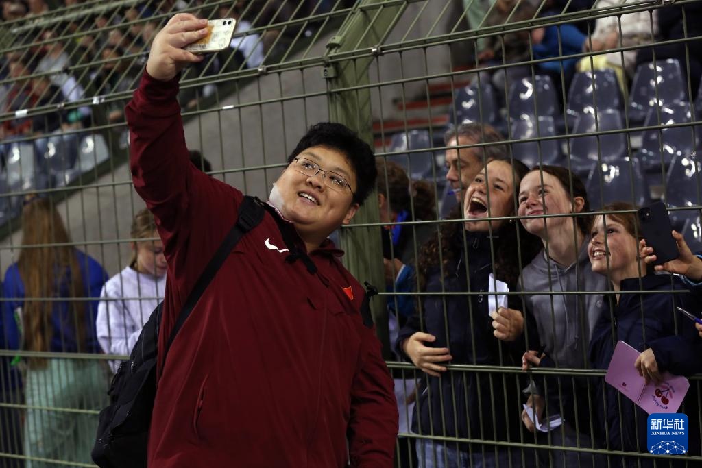 9月13日,宋佳媛(左)在賽后與觀眾合影。新華社記者 趙丁喆 攝