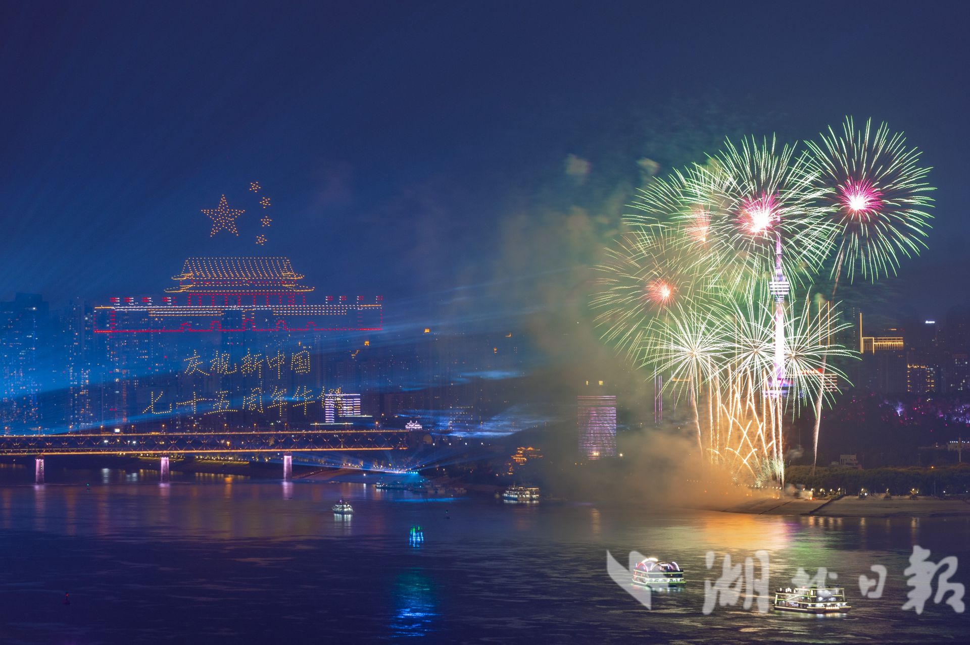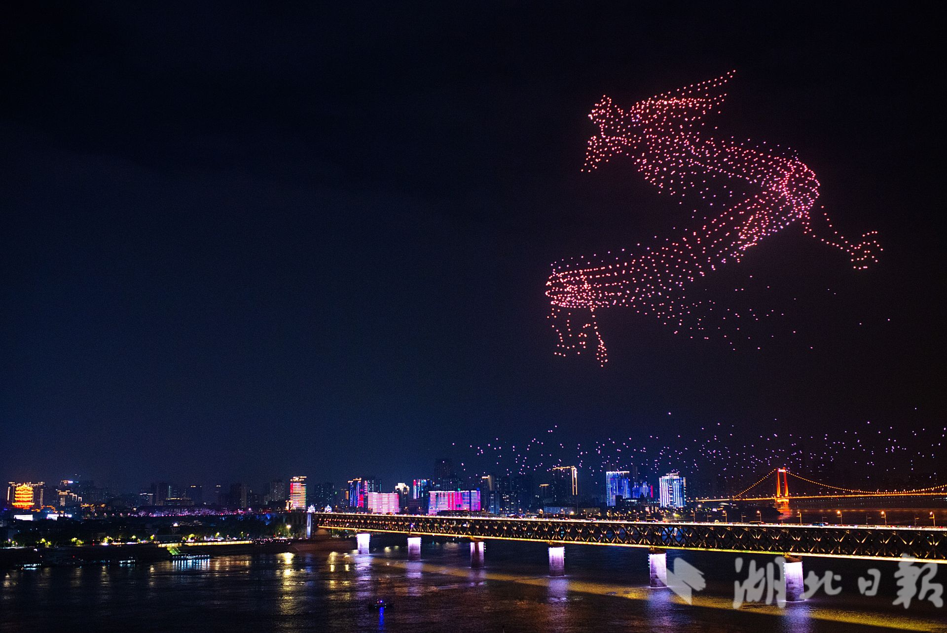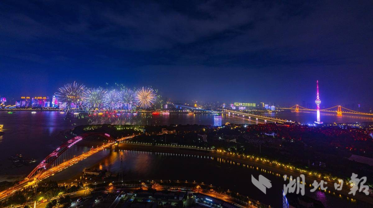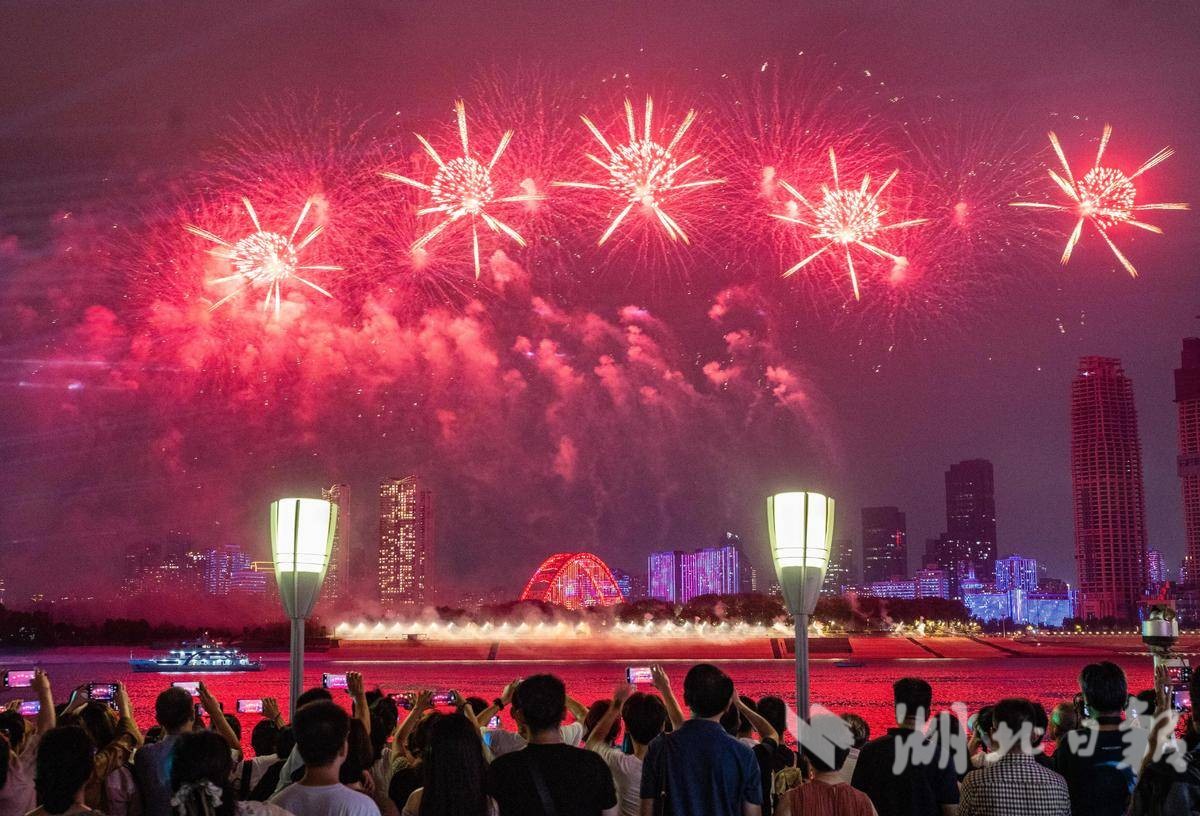 9月14日晚,長江文化藝術季開幕式在武漢兩江四岸之間的長江江面上舉行。絢麗的光影秀、無人機和焰火表演美輪美奐,吸引大批市民、游客觀賞。 (湖北日報全媒記者 魏錸 攝)