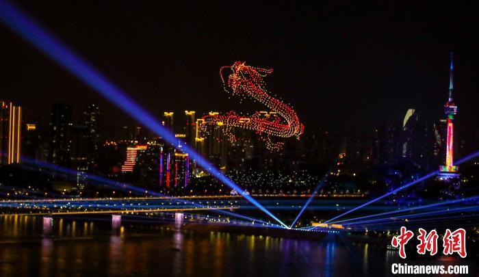 9月14日晚,長江文化藝術(shù)季開幕式在湖北武漢舉行。開幕式以一場點亮長江的大型沉浸式光影秀,著重突出文化和科技融合的特色,聚焦上海、江蘇、浙江、安徽、江西、湖南、重慶、四川、貴州、云南、西藏、青海等長江流域13個省區(qū)市的特色文化元素,上演“以天為幕、以城為景、以長江為舞臺”的璀璨景象,展現(xiàn)長江的風(fēng)景之美、藝術(shù)之美、人文之美、發(fā)展之美。圖為無人機組成的一條巨龍在天空“騰飛”。中新社記者 張暢 攝