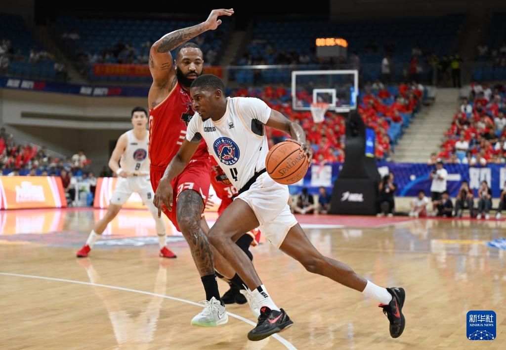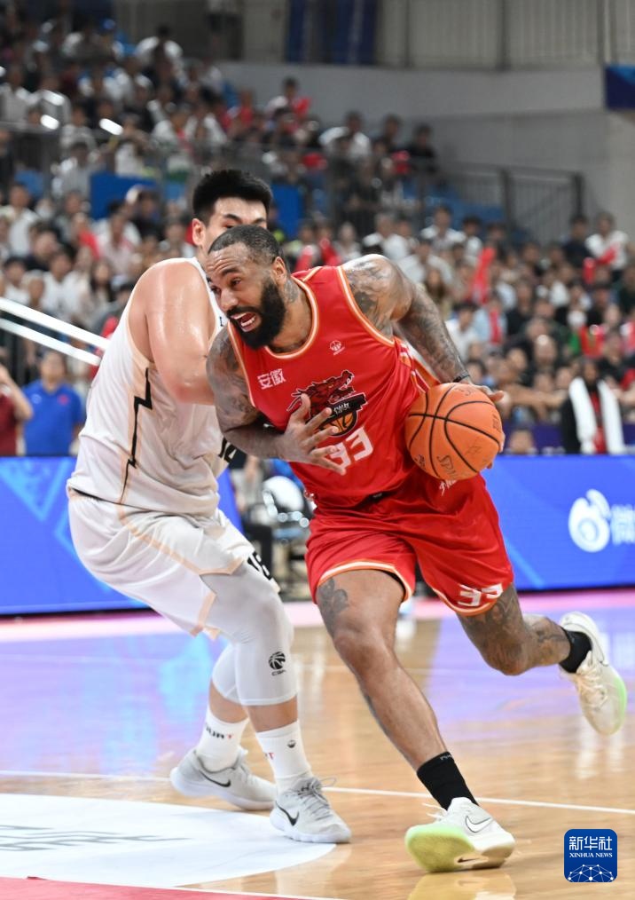 9月14日,安徽文一隊球員特洛伊·吉倫沃特(右)在比賽中進攻。新華社記者 周牧 攝