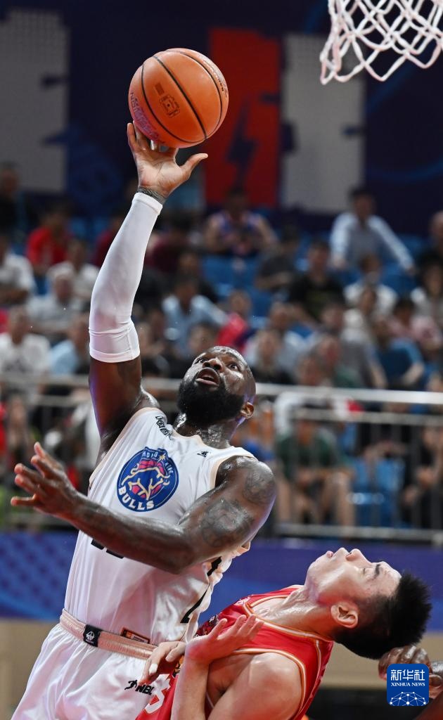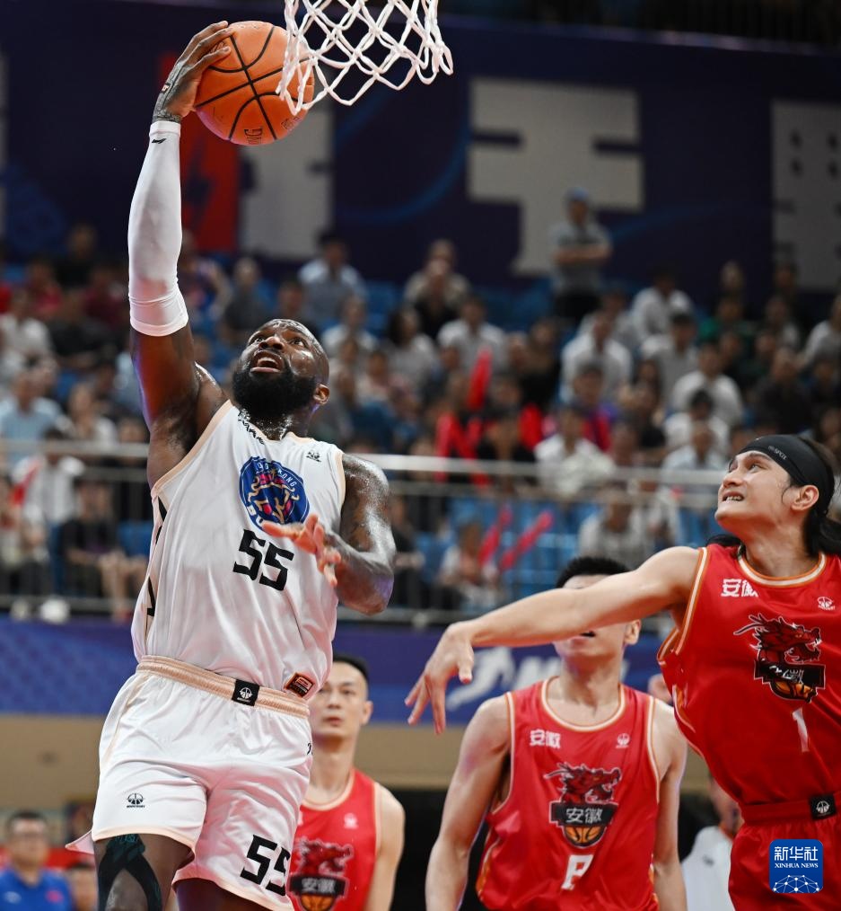 9月14日,安徽文一隊球員特洛伊·吉倫沃特(右)在比賽中扣籃得分。新華社記者 周牧 攝