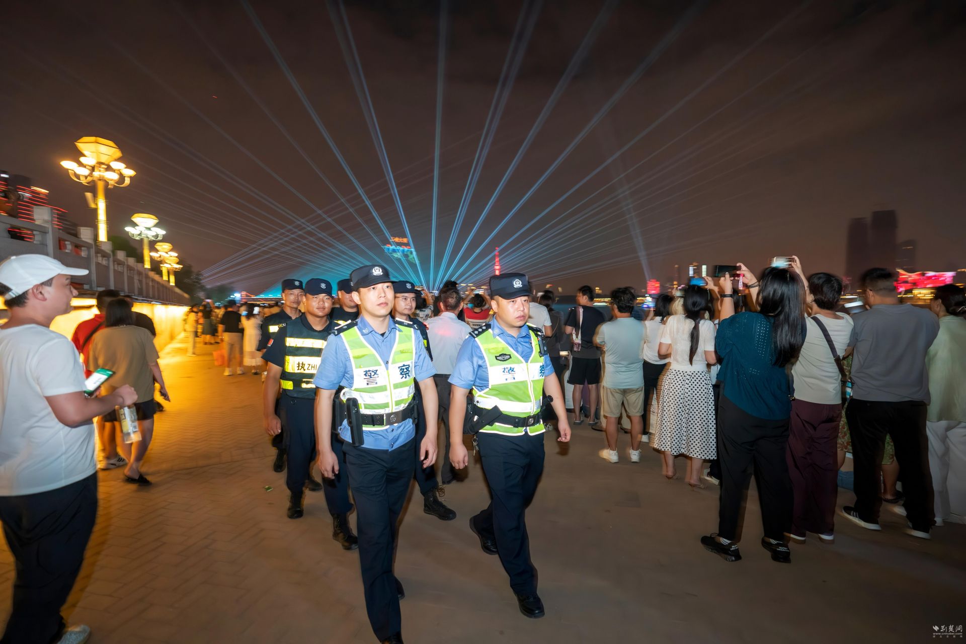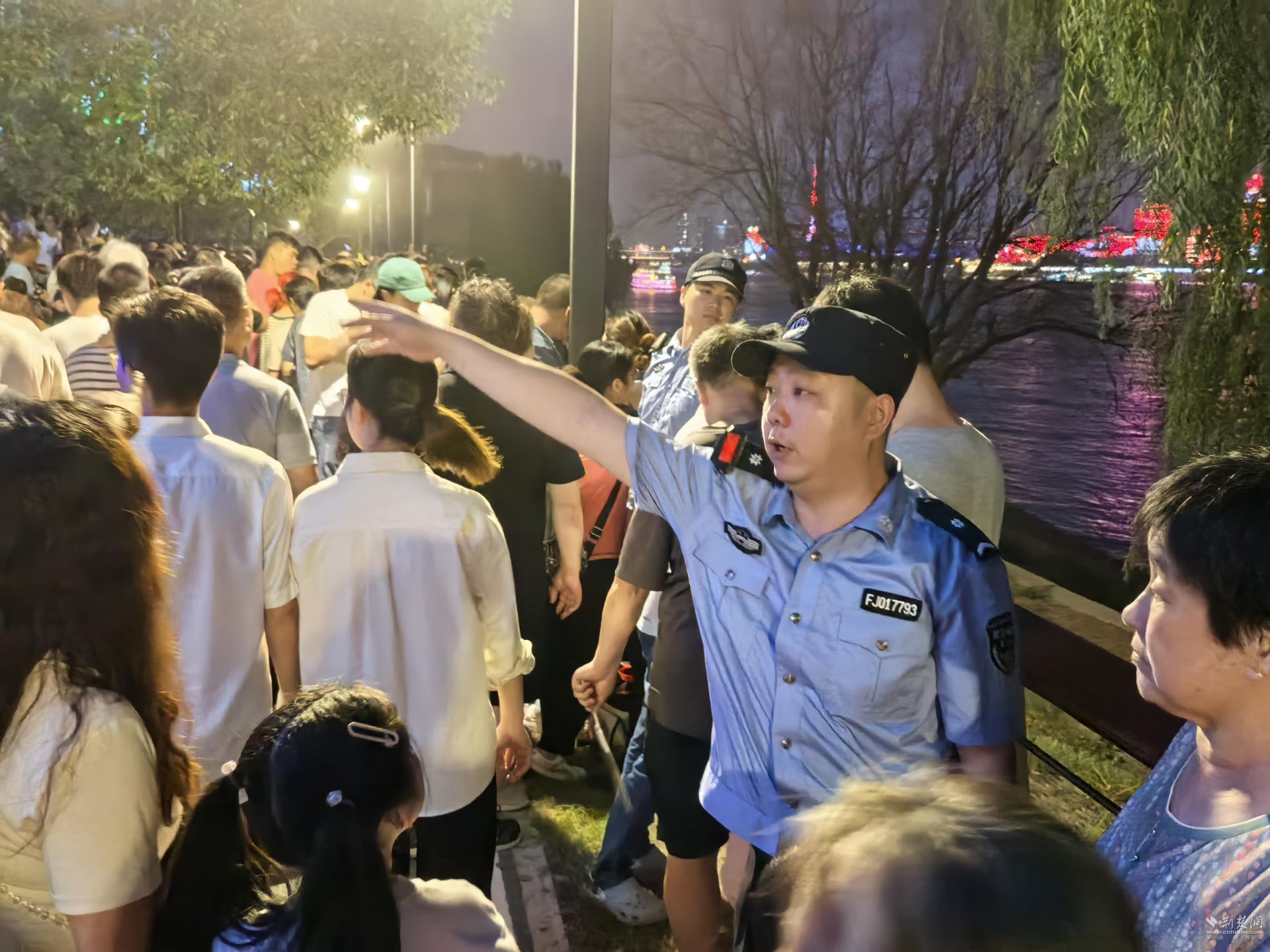 “請注意照看好老人和小孩,不要擁擠。”當日16時,活動開始前3個小時,武昌區公安分局3100余名安保力量全部上崗。在長約8公里的武昌江灘的水岸線上,安保民警們背對江面,面朝人群,隨時提醒現場游客注意安全、謹防落水,筑起了一道堅固的“安全護欄”。