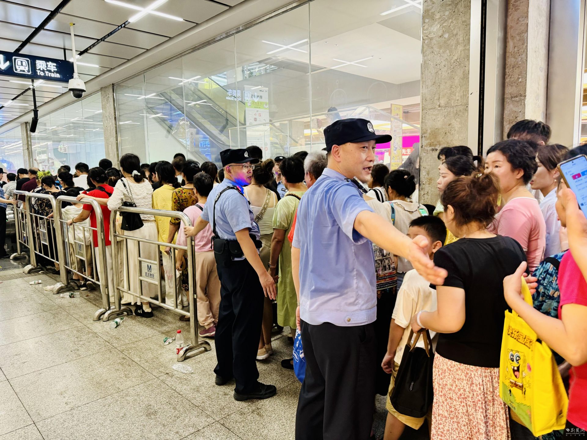 “觀看開幕式活動的市民游客,請服從工作人員的指揮引導,文明、有序觀賞。”在司門口黃鶴樓地鐵站,工作人員提前準備的小喇叭反復播報著語音提示,在站廳醒目位置還張貼有引導提示語。該地鐵站值班民警許德明介紹,當晚,民警輔警們分組值守在出入口、通道等重點部位維護秩序、疏導客流,并隨時接受乘客報警求助。