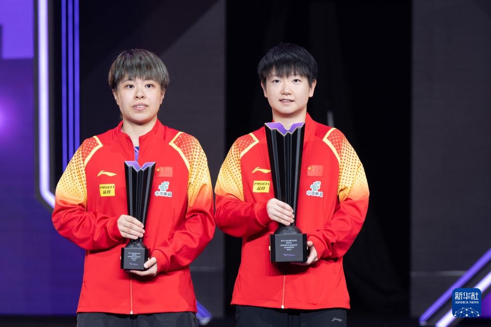 9月15日,孫穎莎(右)和王藝迪在頒獎臺上。新華社記者 張金加 攝