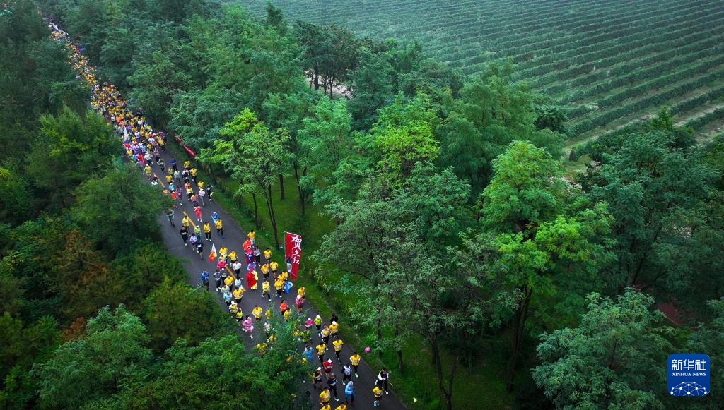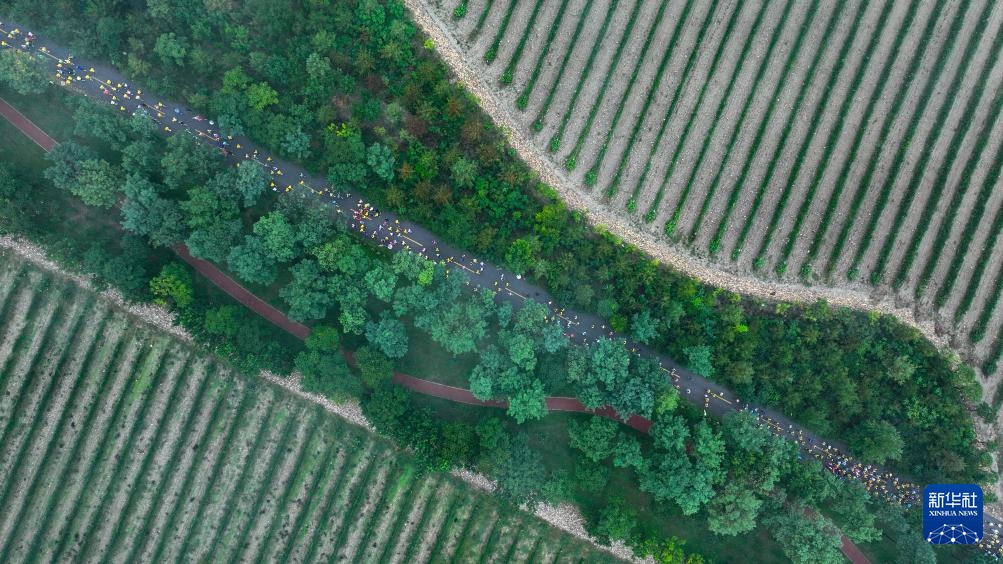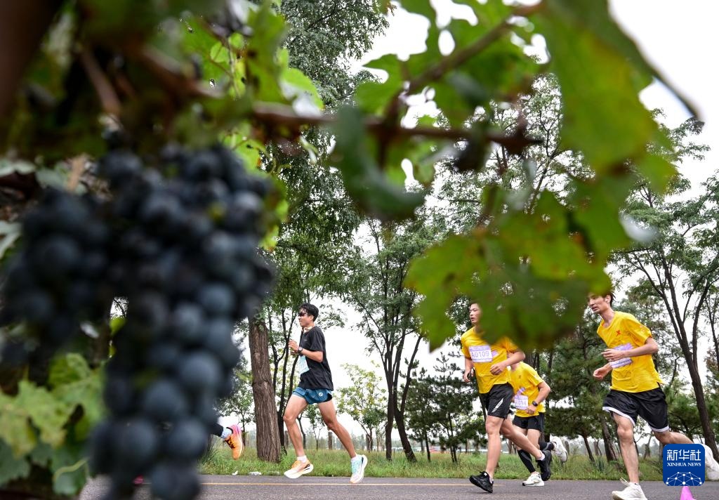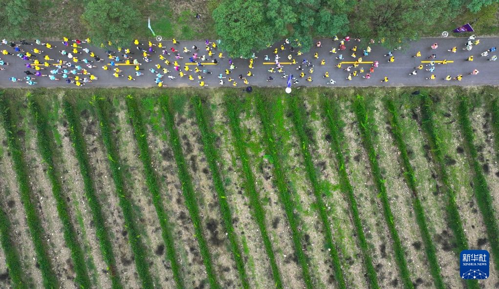 9月16日,選手在比賽中經過一處釀酒葡萄種植園(無人機照片)。新華社記者 馮開華 攝