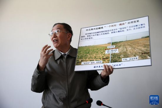 李振聲院士在介紹河北海興鹽堿地治理的前后對(duì)比照片(2014年5月5日攝)。 新華社記者 金立旺 攝