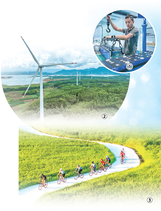 圖①:河南洛陽,某高新技術企業(yè)鋰電池儲能系統(tǒng)生產(chǎn)線。 李衛(wèi)超攝(人民視覺) 圖②:廣西賀州,風力發(fā)電機組源源不斷輸送出清潔電能。 黃勝林攝(人民視覺) 圖③:安徽池州,騎行愛好者綠色出行。 何 清攝(人民視覺) |