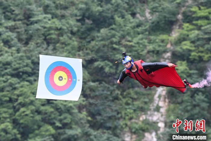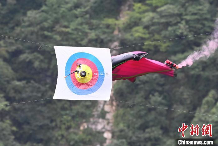 9月19日,第十屆翼裝飛行世界錦標(biāo)賽精準(zhǔn)穿靶決賽在湖南張家界天門山舉行,8位選手在奇峰險(xiǎn)壑間上演“人箭穿靶”。中新社記者 楊華峰 攝