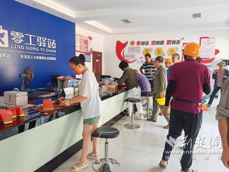 驛站工作人員為勞動者們提供免費涼茶和西瓜等清涼用品。通訊員供圖