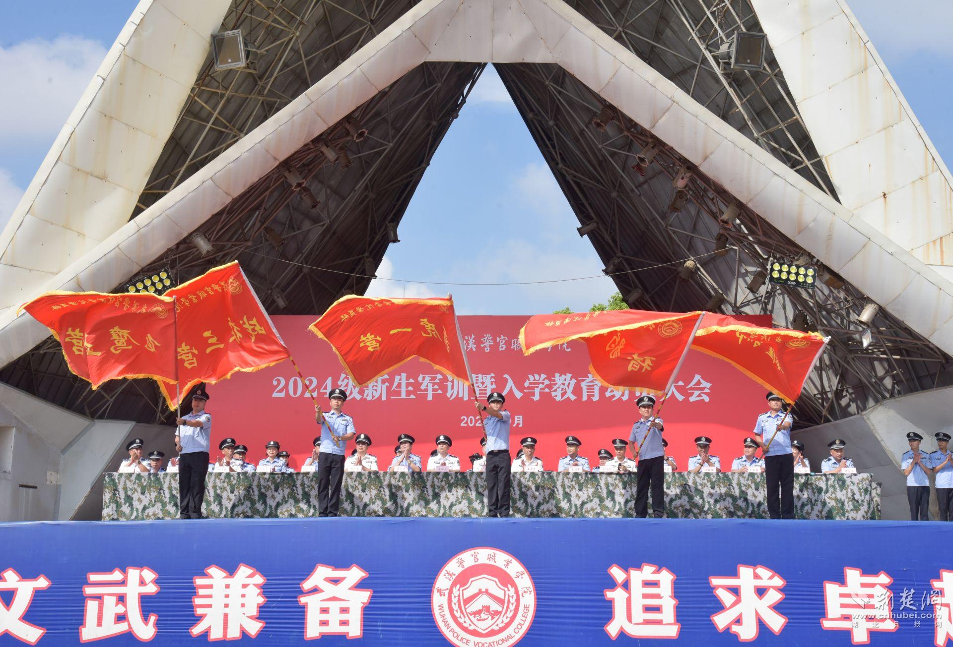 隨后,2024級全體軍訓教官進行莊嚴宣誓。武漢警官職業學院黨委書記、校長陳風華向軍訓旅各營營長授發“營旗”。