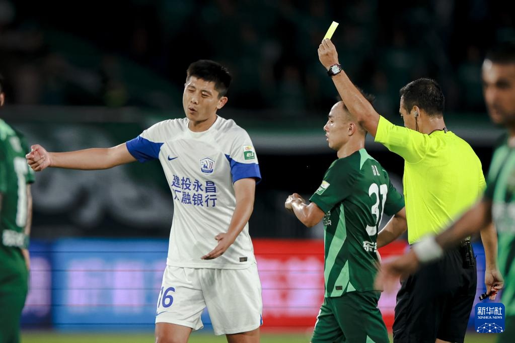 9月22日,主裁判劉威(右)在比賽中向滄州雄獅隊球員鄭凱木(左)出示黃牌。