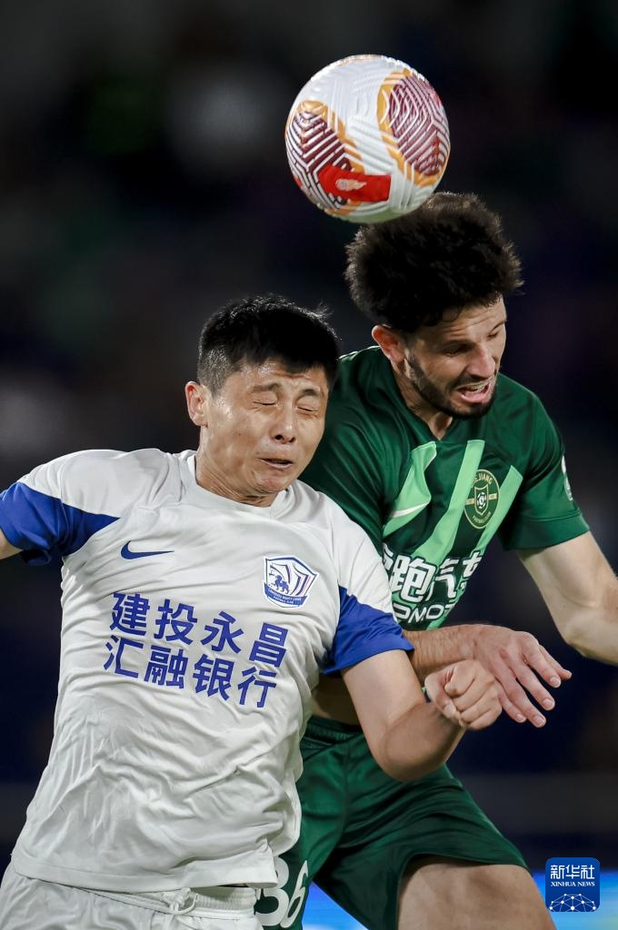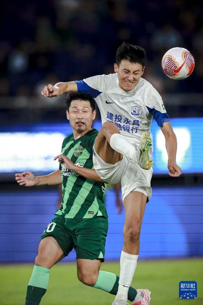 9月22日,浙江隊球員盧卡斯(右)在比賽中與滄州雄獅隊球員鄭凱木爭頂頭球。
