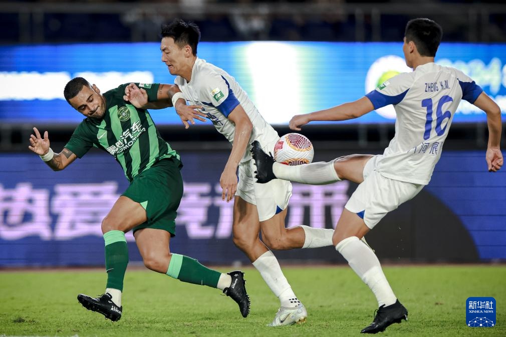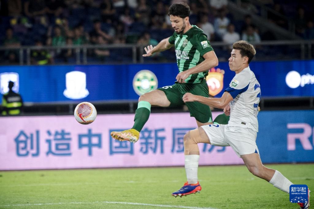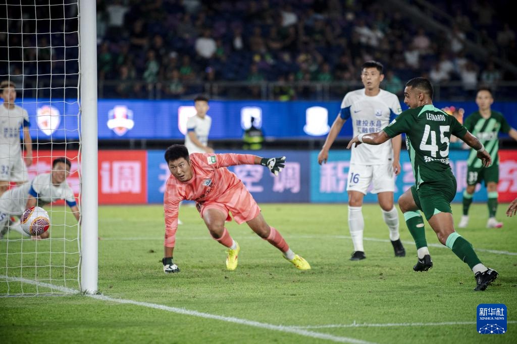 9月22日,浙江隊球員萊昂納多(右一)在比賽中進(jìn)球。隨后,該進(jìn)球被視頻助理裁判(VAR)判定無效。