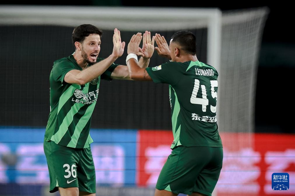 9月22日,浙江隊球員萊昂納多(右)在進(jìn)球后與隊友盧卡斯擊掌慶祝。