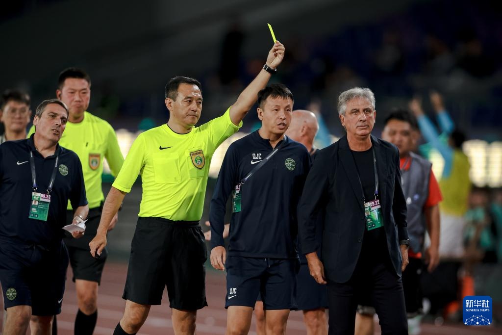 9月22日,主裁判劉威(前右三)在比賽中向浙江隊替補席出示黃牌。