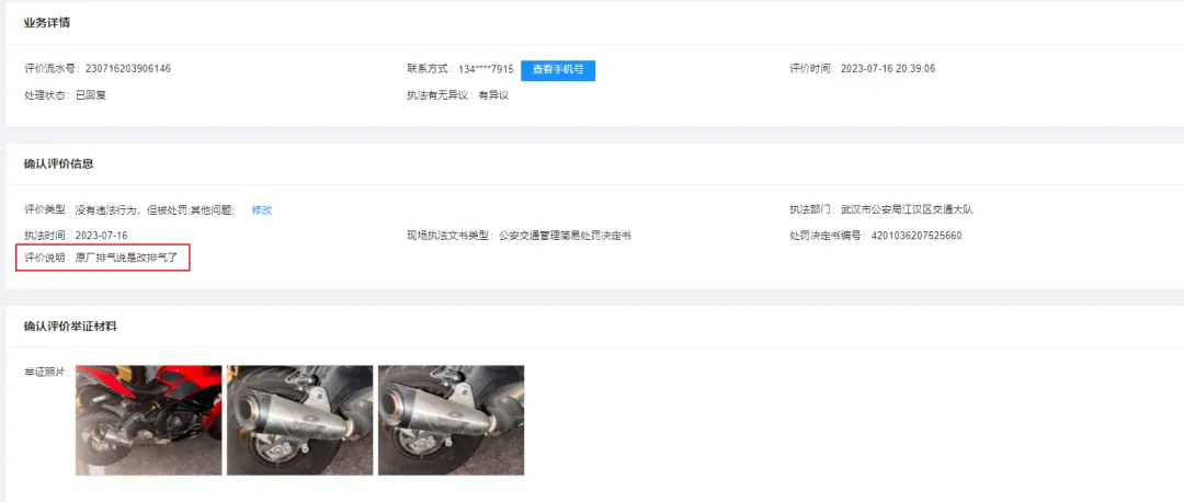 案例3:葉先生騎摩托車被交警現(xiàn)場處罰,因其摩托車排氣管并沒有改裝,所以葉先生認(rèn)為該起處罰不合理,遂通過“執(zhí)法評道”投訴。經(jīng)核實(shí),葉先生反映屬實(shí),摩托車排氣管并沒有改裝,該起處罰不合理。武漢市公安局江漢區(qū)交通大隊(duì)向上級部門申請后撤銷該處罰。