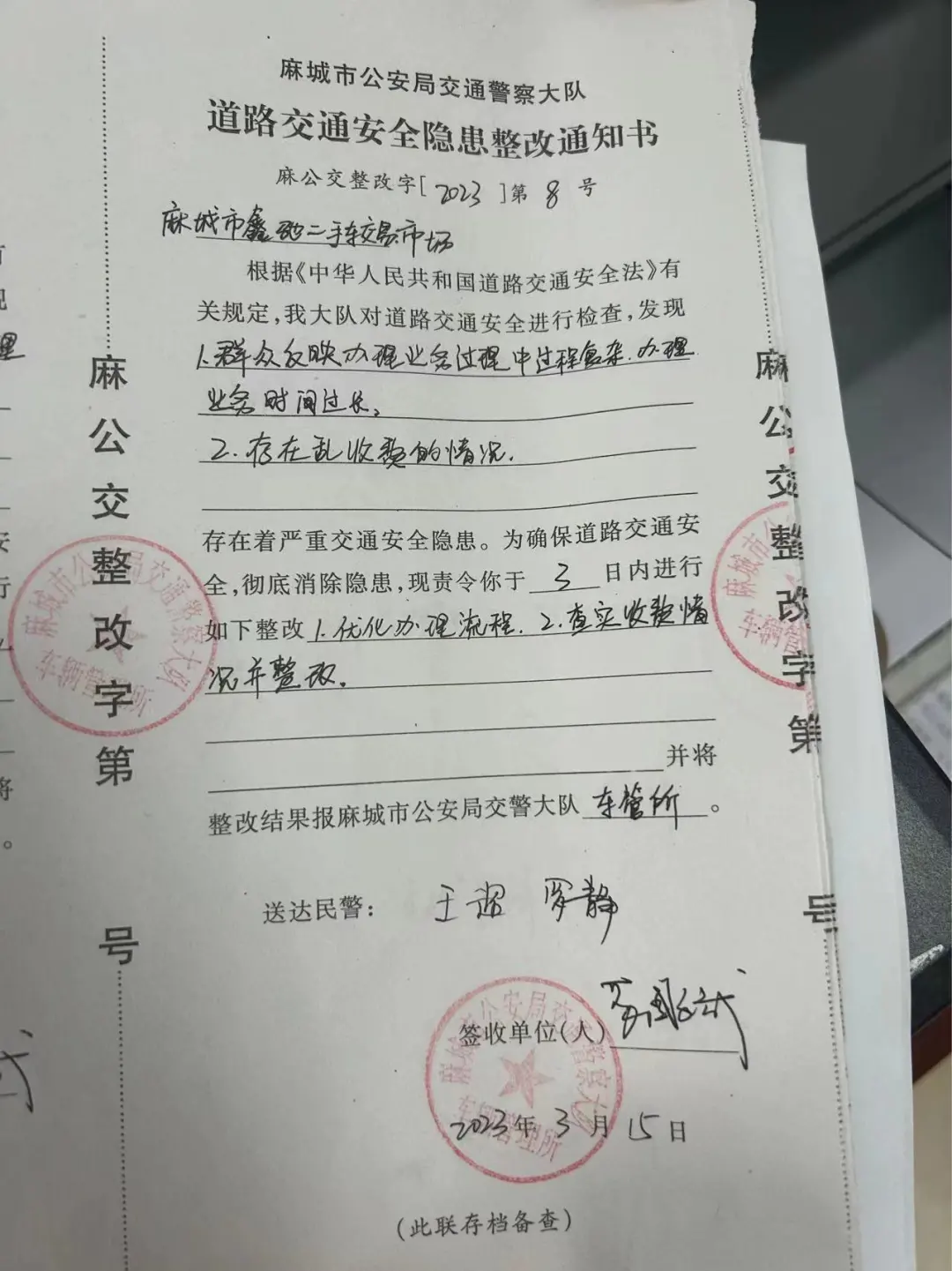 案例1:一群眾通過“執(zhí)法評道”反映在黃岡某服務(wù)站辦理登記業(yè)務(wù)時,被多收費(fèi)不10元錢,麻城市公安局交警大隊(duì)接到反映后,立即上門核實(shí),并下達(dá)整改通知書。
