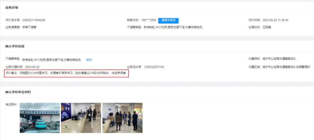案例2:一群眾稱通過“執(zhí)法評道”投訴咸寧市交警支隊(duì)車輛管理所“秩序較亂、辦事效率較低”等問題,車管所接到投訴后立行立改,設(shè)立值日警官窗口,提供全程標(biāo)準(zhǔn)化業(yè)務(wù)咨詢和現(xiàn)場幫辦服務(wù)。