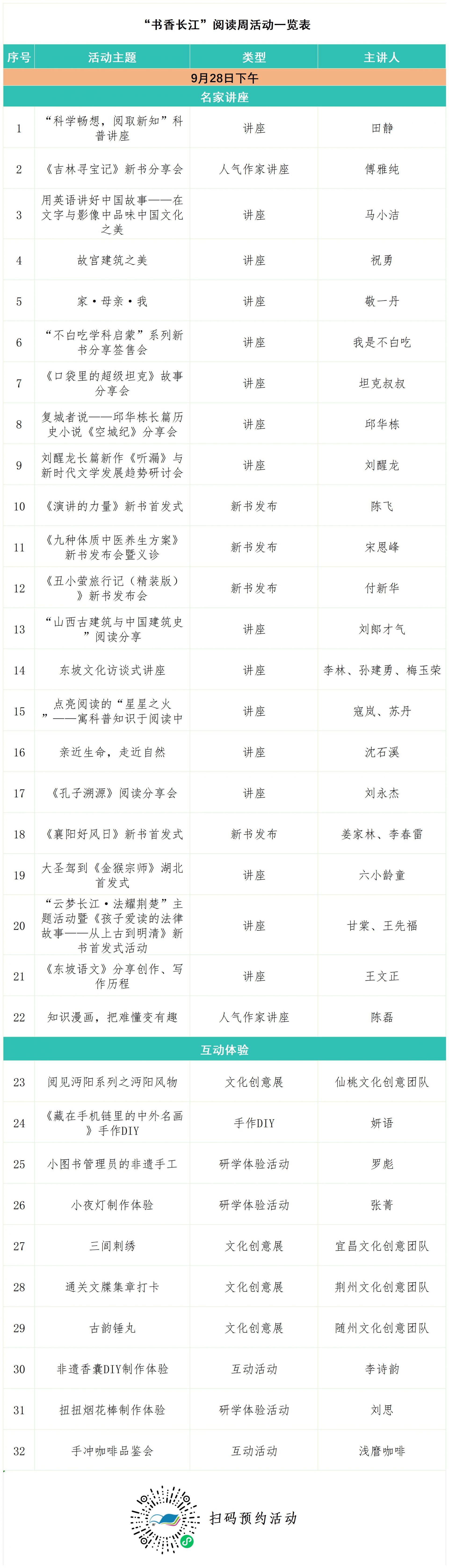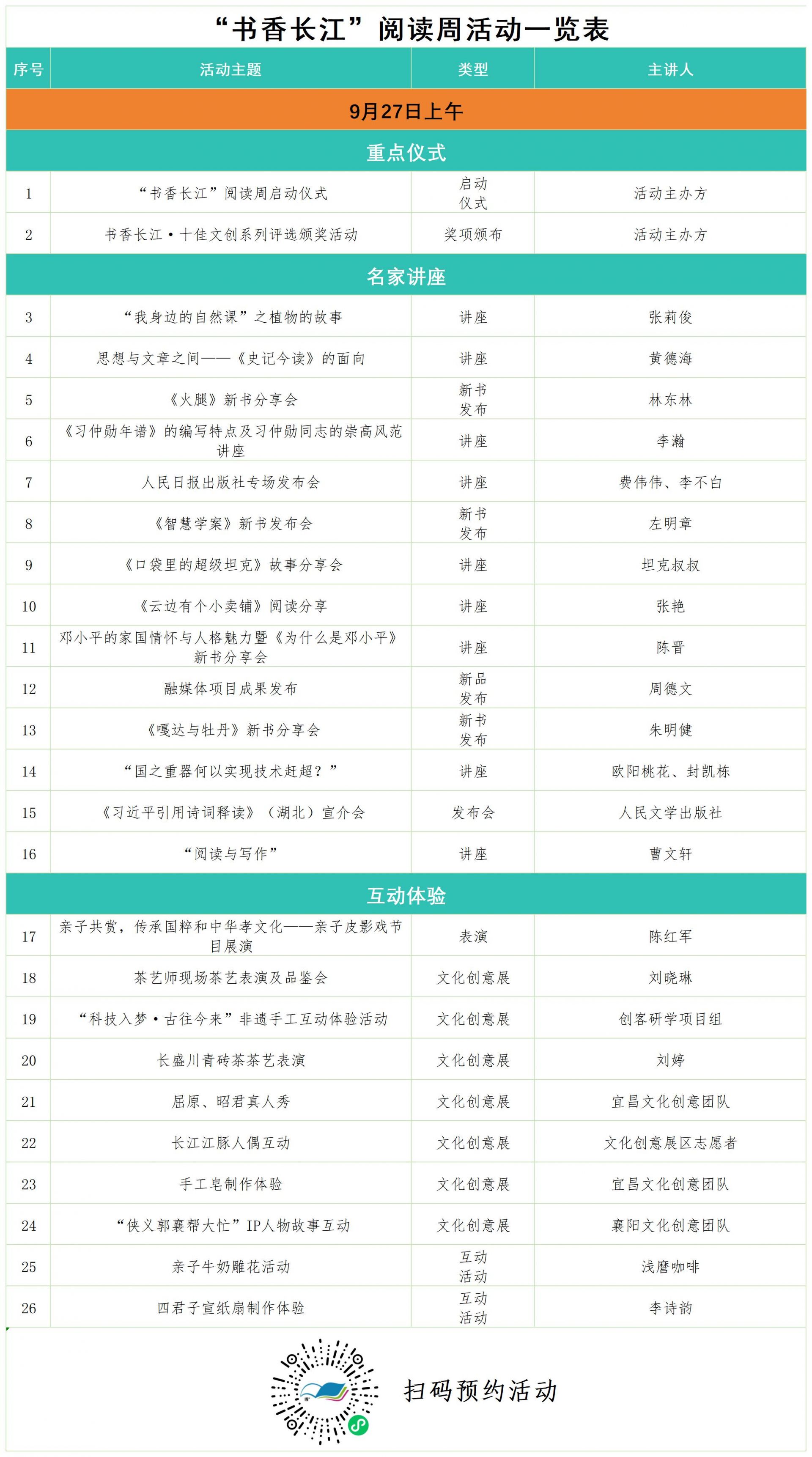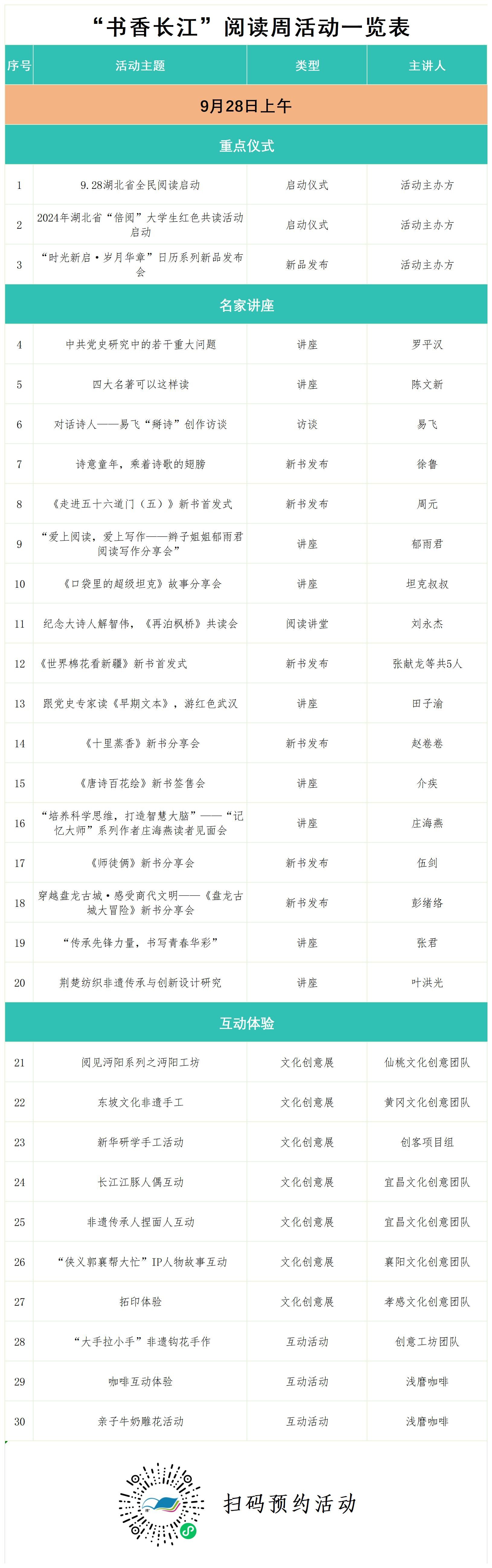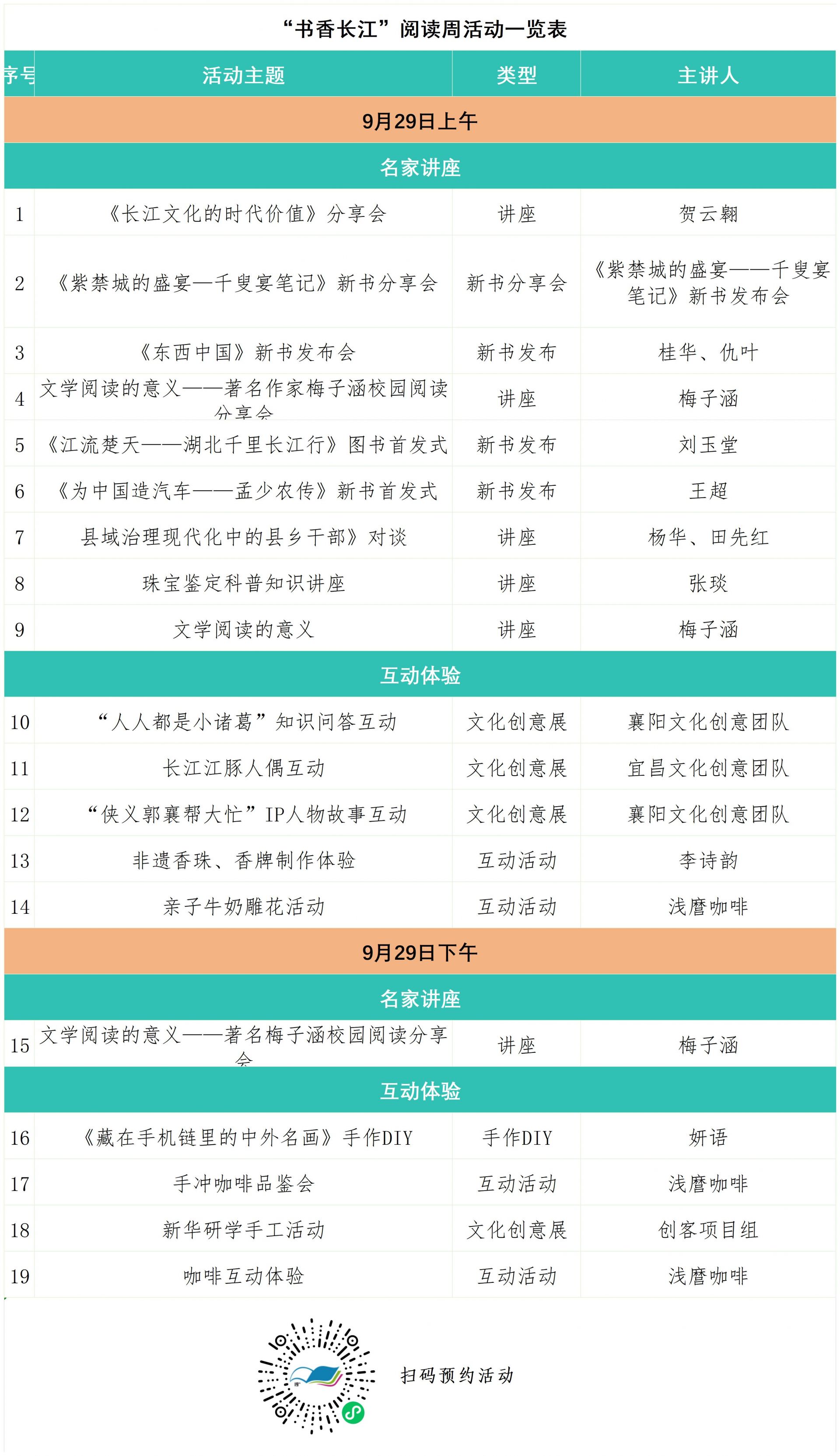 按照安排,將舉辦“書香長江”閱讀周?武漢書展暨第19屆華中圖書交易會啟動儀式、湖北省2024年9.28全民讀書周活動、湖北省“倍閱”大學生紅色共讀活動、“書香長江?十佳文創產品”“書香長江?十佳荊楚禮物”“書香長江?十佳文創企業(機構)”系列評選活動、名家講座與名作分享活動、“品味長江·文化共享”館社店交流研討會暨“百場講書讀荊楚”全省巡講活動啟動儀式。活動方除為廣大讀者策劃舉辦了150余場文化活動外,還將在全省各新華書店分會場策劃“書香長江”閱讀周?武漢書展閱讀嘉年華十大文化惠民活動近千場,讓讀者盡情享受閱讀之旅。