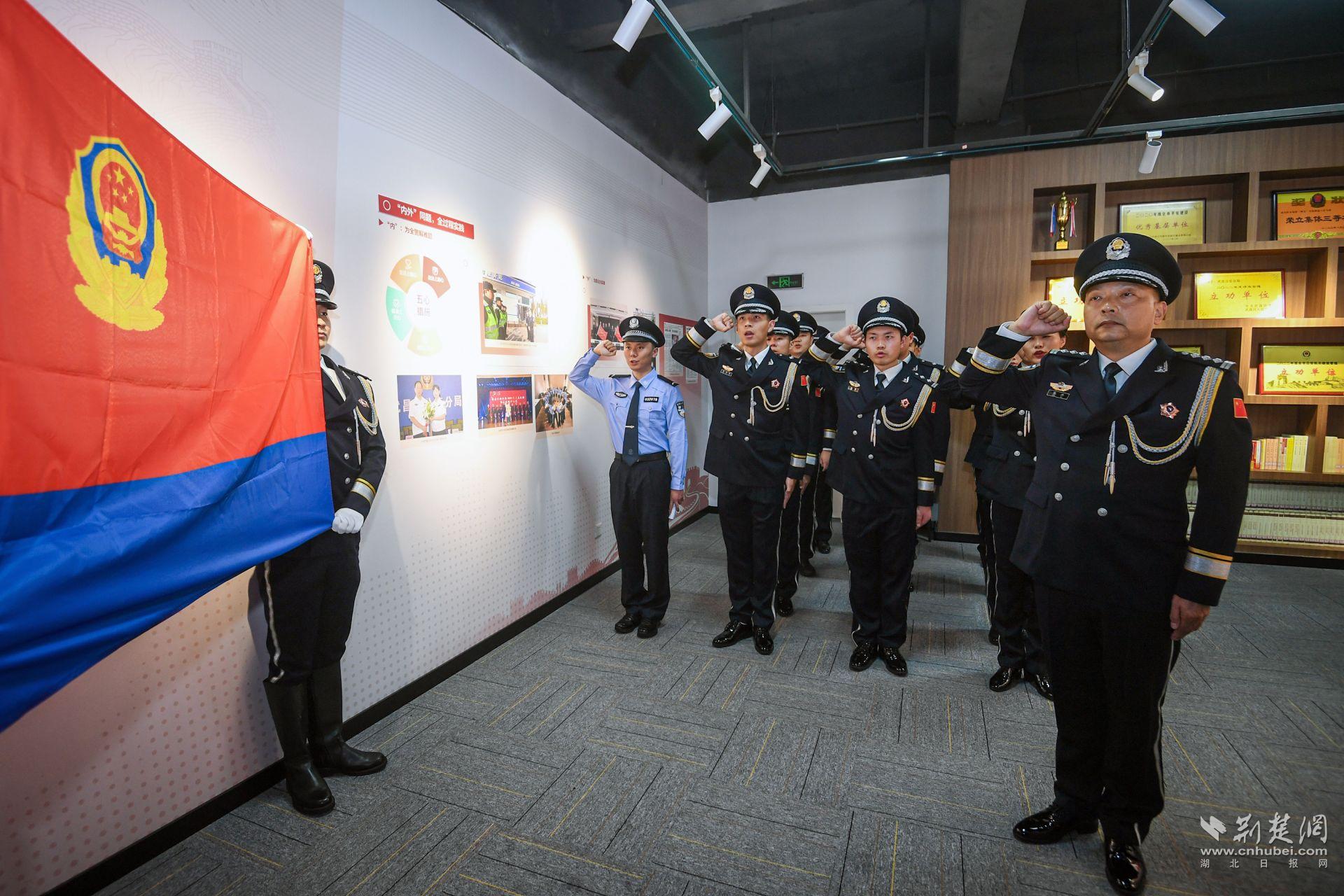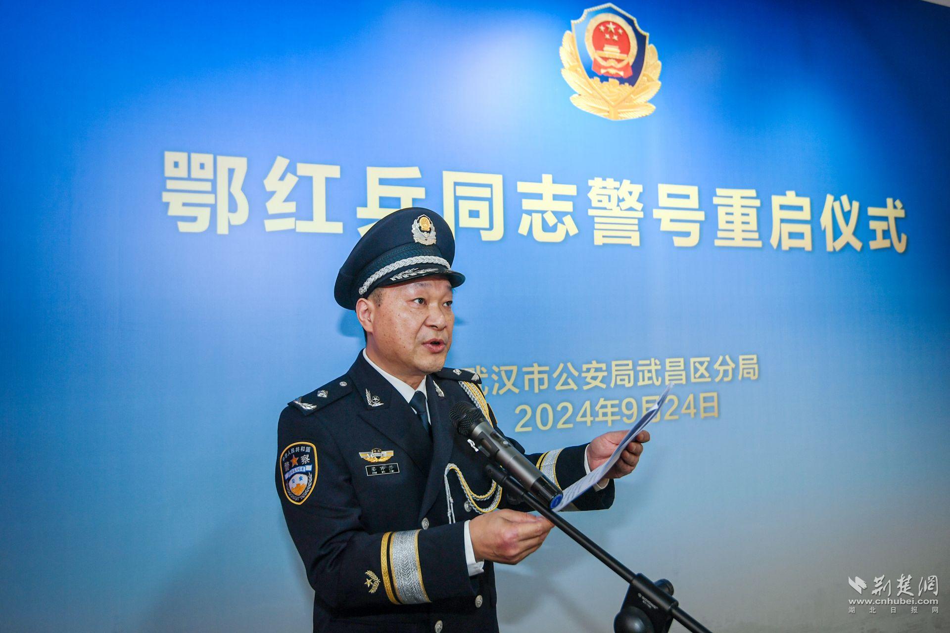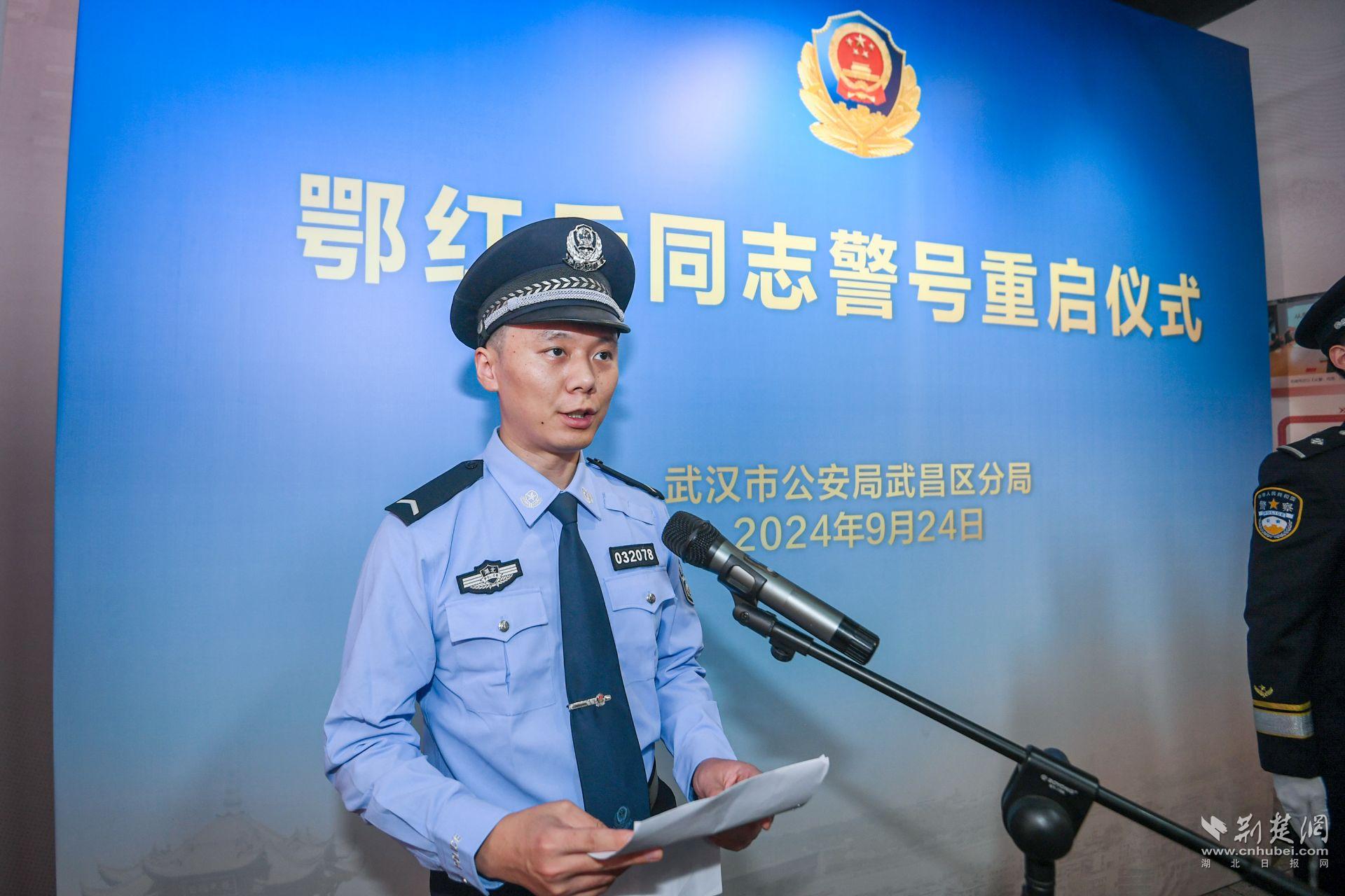 當日下午3時,武昌區分局黨建中心內莊嚴肅穆,12名青年民警代表整齊列隊、警容嚴整。分局黨委委員、政治處主任欒偉芳宣讀《鄂紅兵同志警號重啟決定》后,兩名警禮標兵雙手托舉著鄂紅兵同志生前使用的警號、胸章正步走到隊伍前方。武昌區副區長、區公安分局局長徐舫鄭重地為新警鄂靖佩戴上“032078”這枚象征著兩代公安人精神傳承的警號。“032078報到!” “歸隊!”