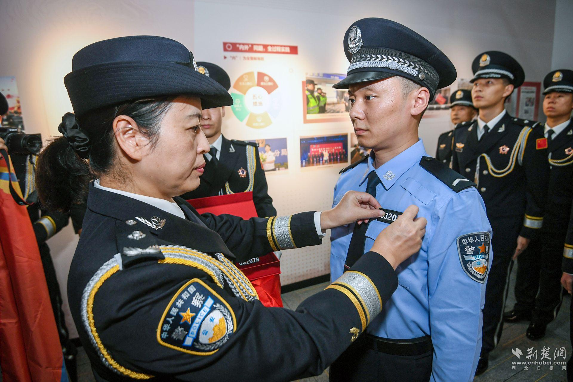 武昌區副區長、區公安分局局長徐舫為新警鄂靖佩戴上警號。通訊員供圖
