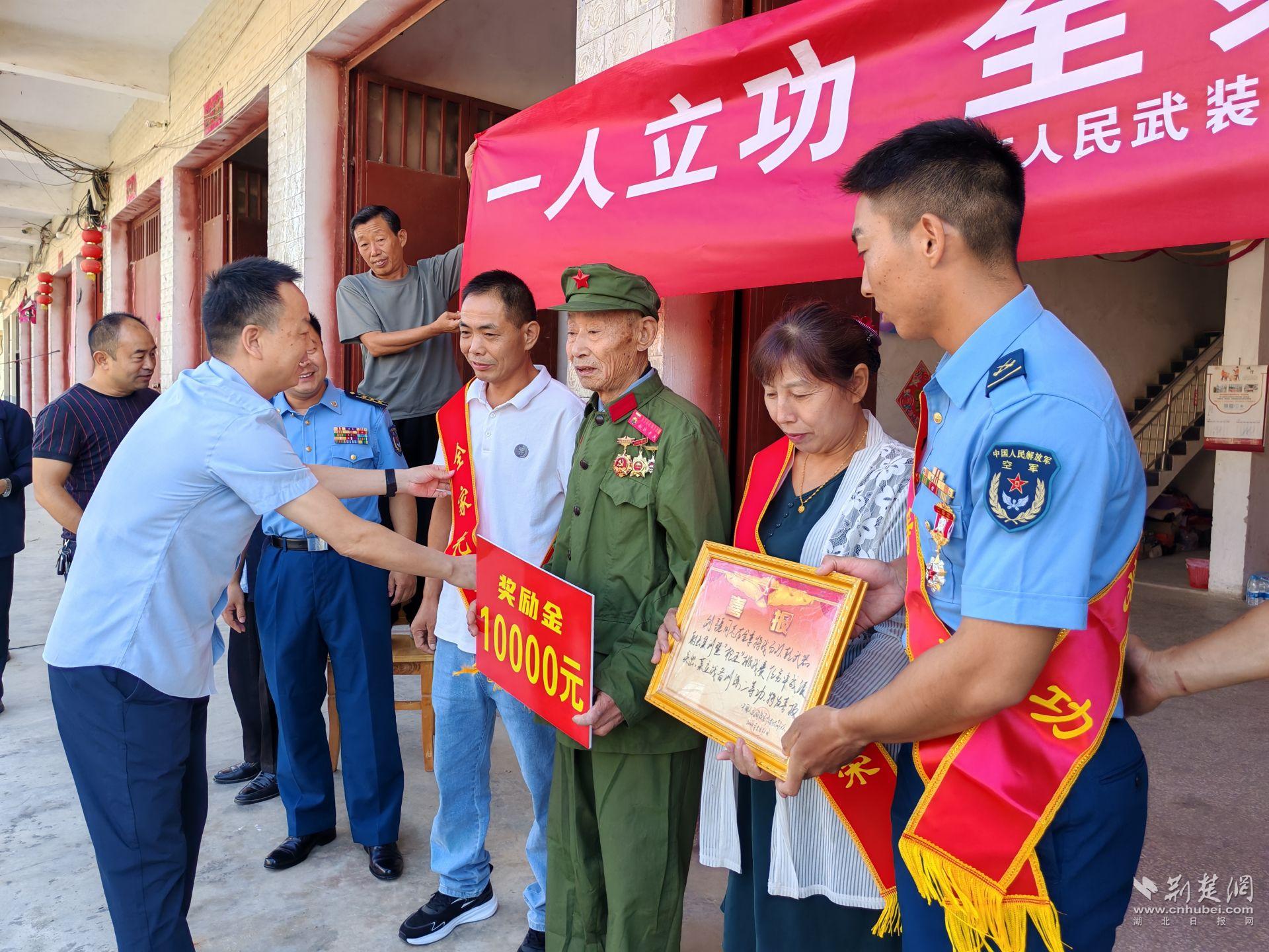“劉疆入伍以來,不怕苦不怕累,練就了過硬的軍事素質(zhì),多次在比武中取得優(yōu)異成績,感謝你們?yōu)椴筷犈囵B(yǎng)輸送了優(yōu)秀男兒。”軍地領(lǐng)導(dǎo)為劉疆及其父母佩戴綬帶,送上喜報、鮮花和獎勵金。
