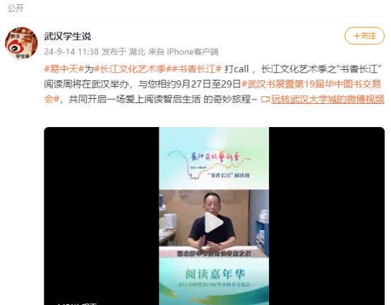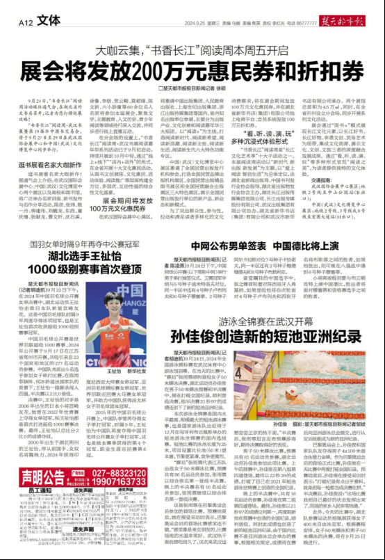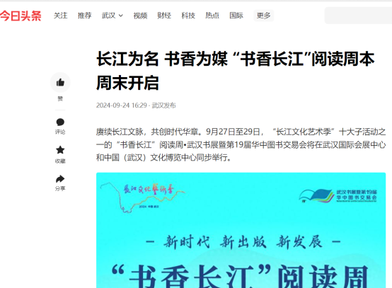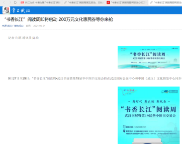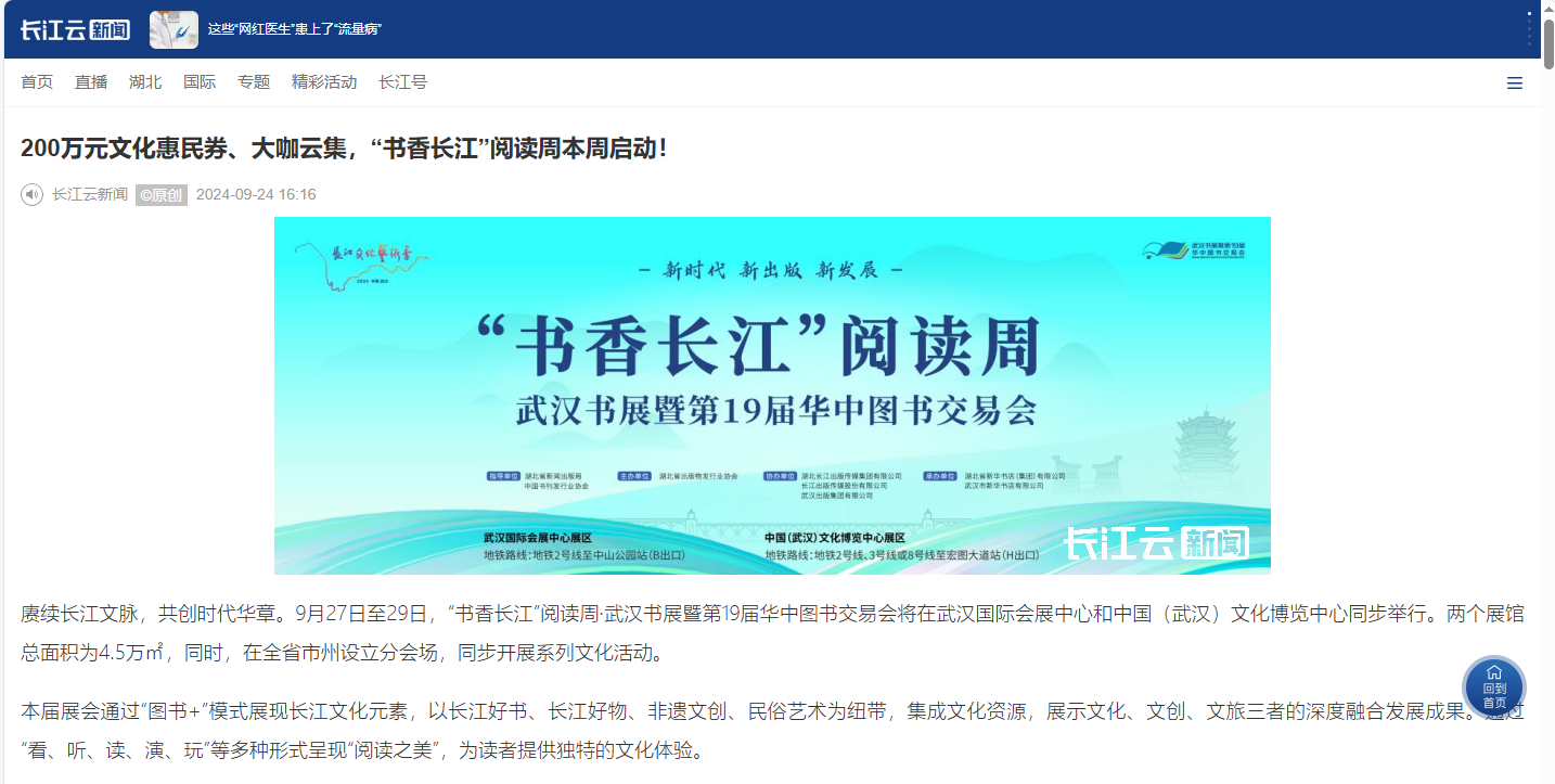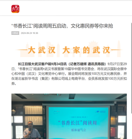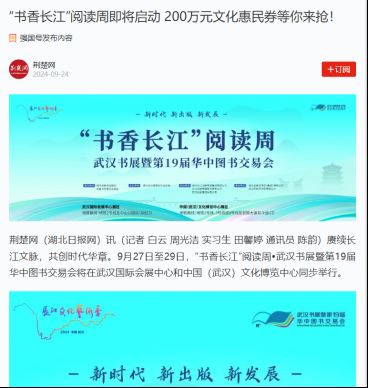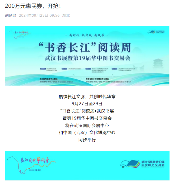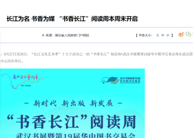 荊楚網(湖北日報網)訊(記者 白云 周光潔 實習生 田馨婷)賡續長江文脈,共創時代華章?!皶汩L江”閱讀周?武漢書展暨第19屆華中圖書交易會將于9月27日至29日在武漢國際會展中心和中國(武漢)文化博覽中心同步舉行。