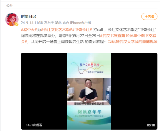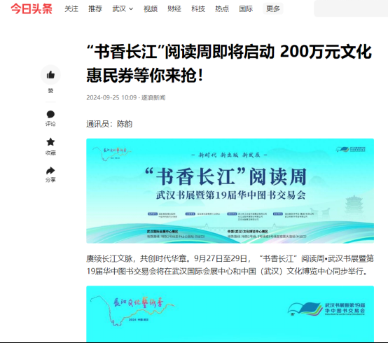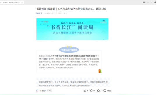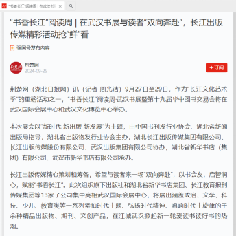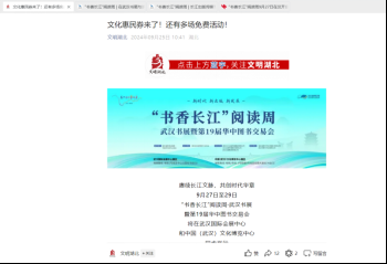 截至9月25日晚,據荊楚網輿情大數據基地檢測,全網共計91家媒體和平臺轉載,其中網頁35條,客戶端35條,微信6條,微博10條,視頻號5條,新聞全網曝光超過2800萬人次。#書香長江閱讀周#微博話題達到1000萬以上。