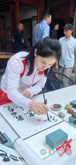 在一曲曲婉轉動聽的古箏曲氛圍的熏陶下,在古色古香的白族民居與各位藝術大師的交流中,奧運健兒們對體育與藝術結合的創作形式充滿興趣,躍躍欲試,尤其是2024年巴黎奧運會女子舉重59公斤級冠軍羅詩芳在藝術大師黃河為其書寫的“我由自己定義”的座右銘上用毛筆落款簽字。