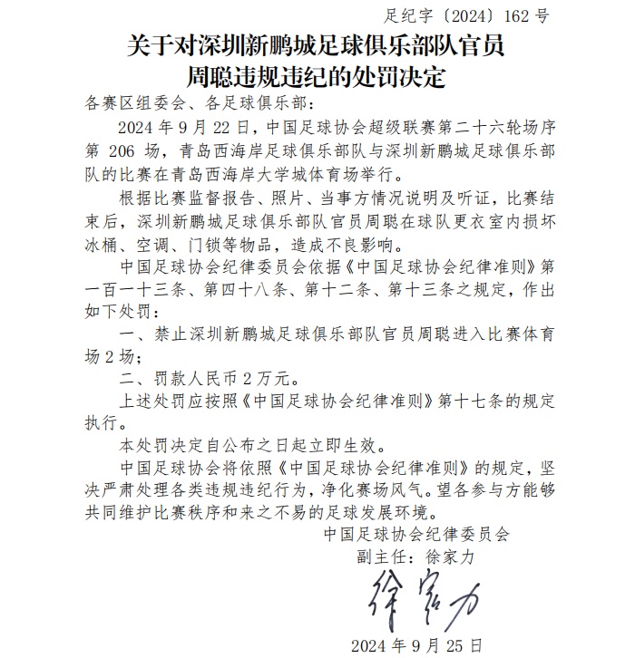新華社北京9月26日電 中國足協(xié)26日發(fā)布公告,深圳新鵬城足球俱樂部官員周聰因在賽后損壞更衣室物品被處以禁止進入比賽體育場兩場的處罰。