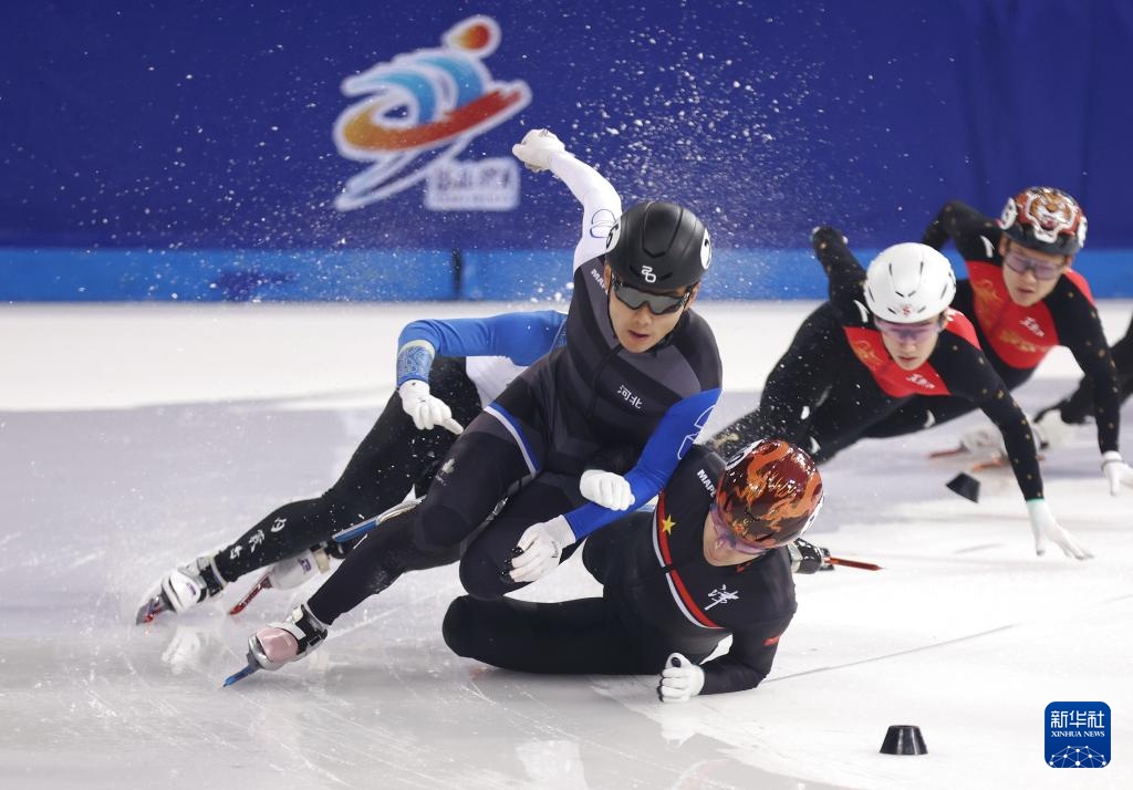 9月26日,天津市冬季和水上運(yùn)動管理中心選手劉少昂(前左)在男子甲組1500米首輪比賽中摔倒。他最終被判進(jìn)半決賽。