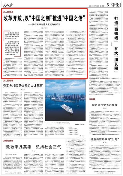 歷史和現實充分證明,改革開放是堅持和發展中國特色社會主義、實現中華民族偉大復興的必由之路。前進道路上,錨定總目標,緊扣推進中國式現代化,葆有“犯其至難而圖其至遠”的勁頭,激揚“越是艱險越向前”的精氣神,寫好改革的“時代新篇”,定能讓“中國之制”持續鍛造新優勢,讓“中國之治”不斷開啟新境界。【全文】