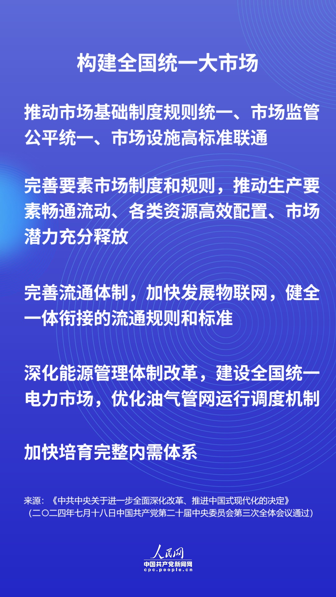 一是規(guī)范不當(dāng)市場競爭和市場干預(yù)行為。公平競爭是市場經(jīng)濟(jì)的基本原則和建設(shè)全國統(tǒng)一大市場的客觀要求,《決定》強(qiáng)調(diào)要清理和廢除妨礙全國統(tǒng)一市場和公平競爭的各種規(guī)定和做法。二是強(qiáng)化統(tǒng)一的市場監(jiān)管。針對(duì)監(jiān)管規(guī)則不完善、執(zhí)法尺度不一致、監(jiān)管能力不匹配等問題,《決定》強(qiáng)調(diào)要提升市場綜合監(jiān)管能力和水平。三是完善要素市場制度和規(guī)則。要素市場是整個(gè)市場體系的基礎(chǔ),《決定》強(qiáng)調(diào)要推動(dòng)生產(chǎn)要素暢通流動(dòng)、各類資源高效配置、市場潛力充分釋放。四是完善流通體制。流通是經(jīng)濟(jì)循環(huán)的“血脈”,《決定》對(duì)此從技術(shù)支撐、規(guī)則標(biāo)準(zhǔn)、物流成本和能源管理等方面作出部署。五是加快培育完整內(nèi)需體系。構(gòu)建全國統(tǒng)一大市場,必須把超大規(guī)模市場優(yōu)勢(shì)和巨大內(nèi)需潛力充分激發(fā)出來。《決定》從投資和消費(fèi)兩個(gè)方面提出了改革舉措,有利于擴(kuò)大有效益的投資、激發(fā)有潛能的消費(fèi)。【全文】