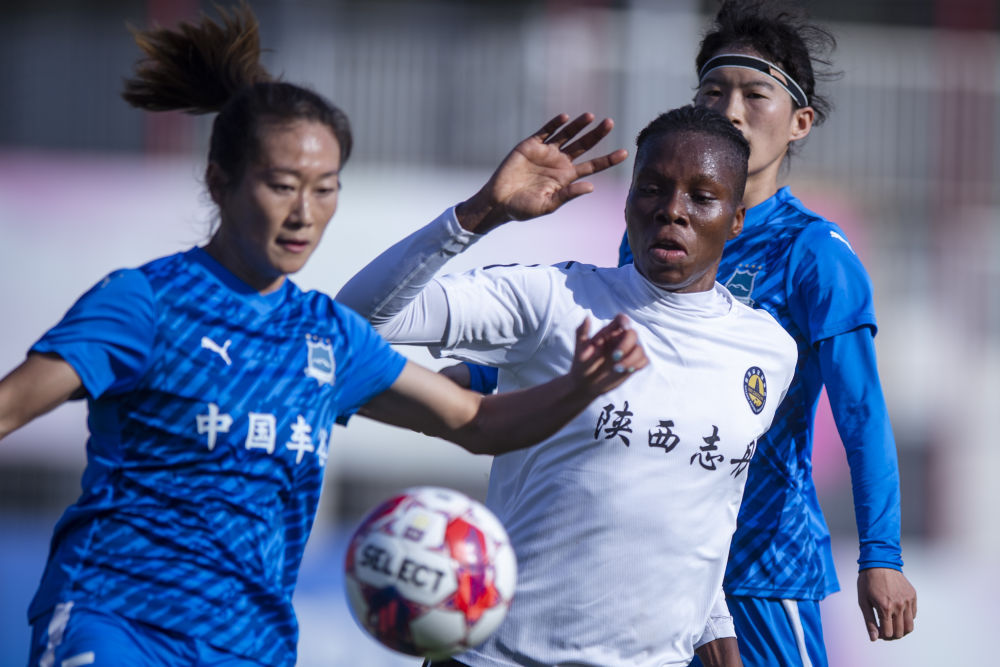 9月28日,陜西志丹隊球員朱麗葉·伊莫·貝希(中)和武漢車谷江大隊球員吳海燕(左)在比賽中拼搶。新華社記者 伍志尊 攝