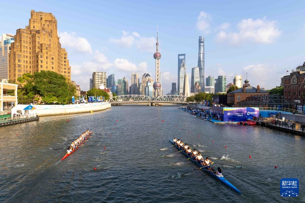 9月28日,上海海洋大學賽艇隊(下)在八人艇500米城市沖刺賽高校組M8+比賽中。