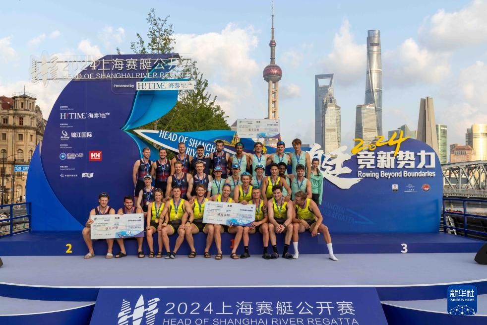 9月28日,冠軍澳大利亞國家賽艇隊(中)、亞軍英國國家賽艇隊(左)、季軍劍橋大學賽艇隊在八人艇500米城市沖刺賽精英組M8+頒獎儀式上。