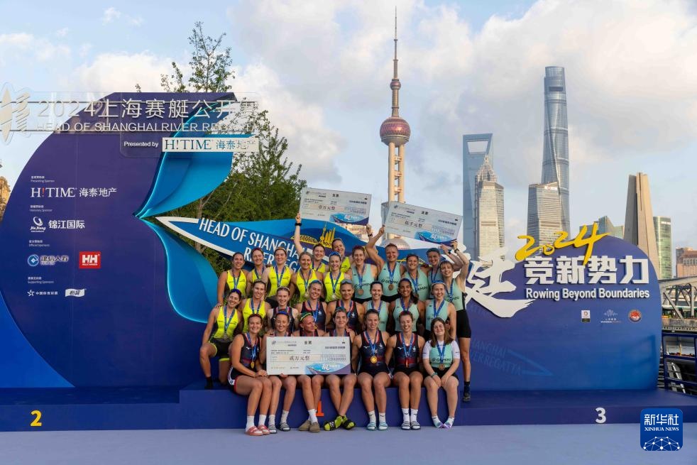 9月28日,冠軍英國國家賽艇隊(中)、亞軍澳大利亞國家賽艇隊(左)、季軍劍橋大學賽艇隊在八人艇500米城市沖刺賽精英組W8+頒獎儀式上。