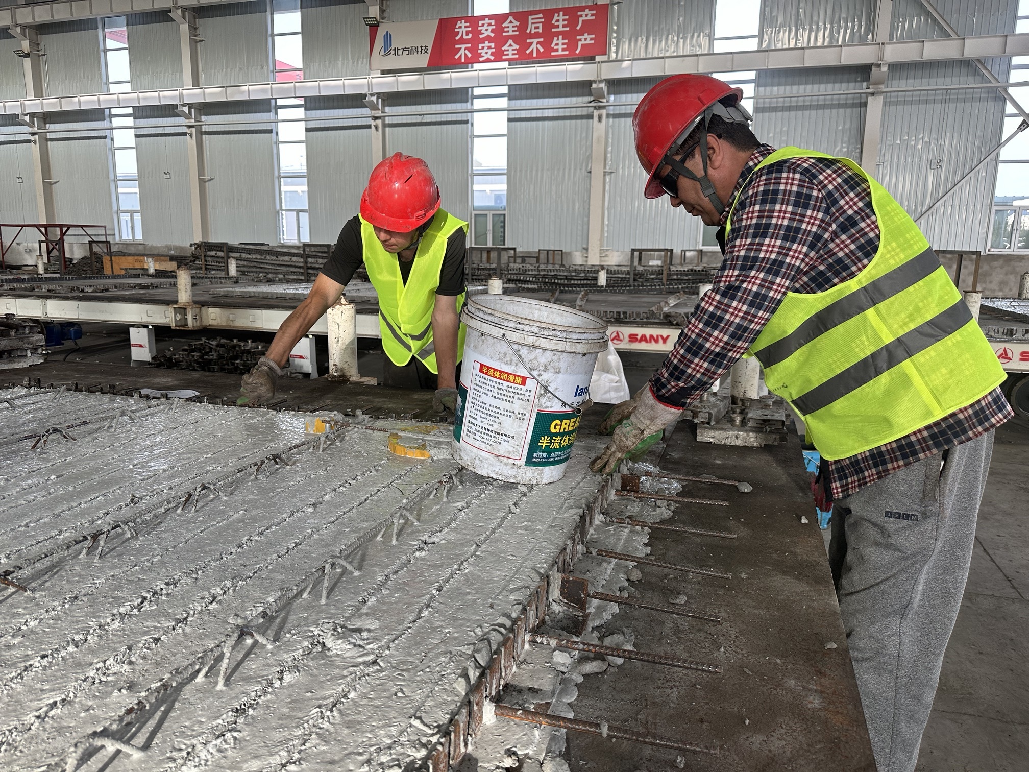 在生產(chǎn)車間,工人正在生產(chǎn)裝配式建筑配件疊合板。人民網(wǎng)記者 楊睿攝