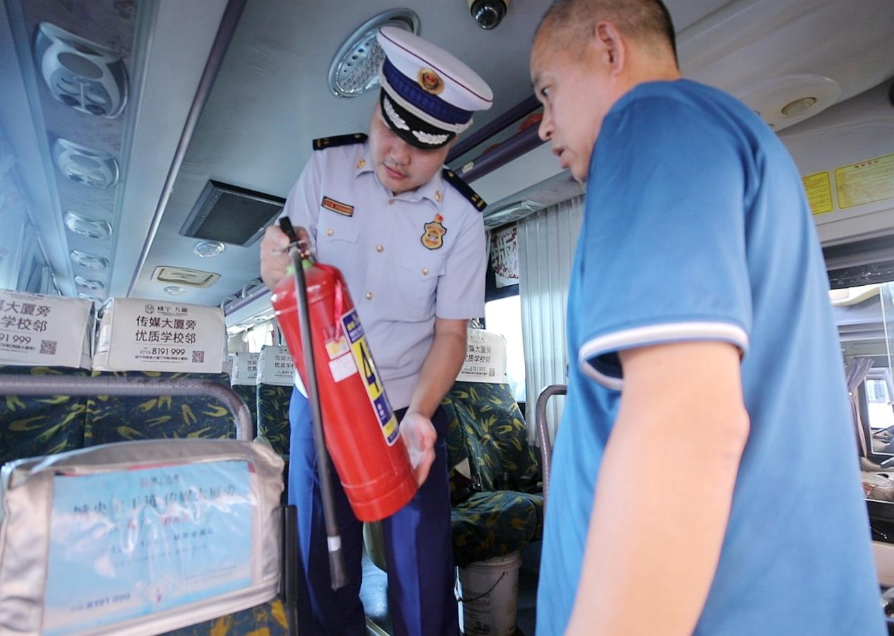 “每輛客車里都必須是要配備滅火器等消防設施的,并且是要保持完好會使用”同時,仔細檢查了車載消防設施設備是否完好有效,抽查了車輛駕駛員對滅火器材運用的熟悉情況等,對從業人員是否會報火警、是否掌握滅火器材的使用方法、在火災發生時是否會引導旅客安全疏散等進行抽查。