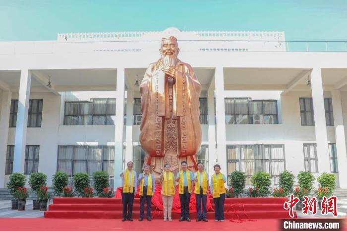 一尊純銅鑄造,像高7.2米,重達5噸的孔子像在上海市嘉定一中落成揭幕。(中國孔子基金會孔子世家專項基金供圖)