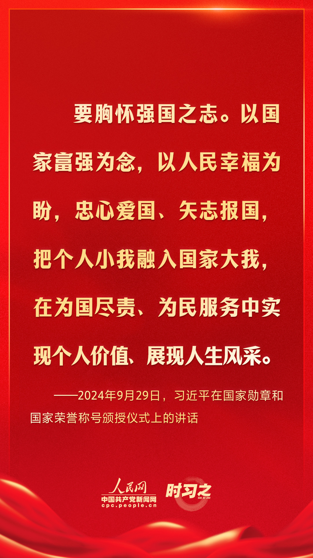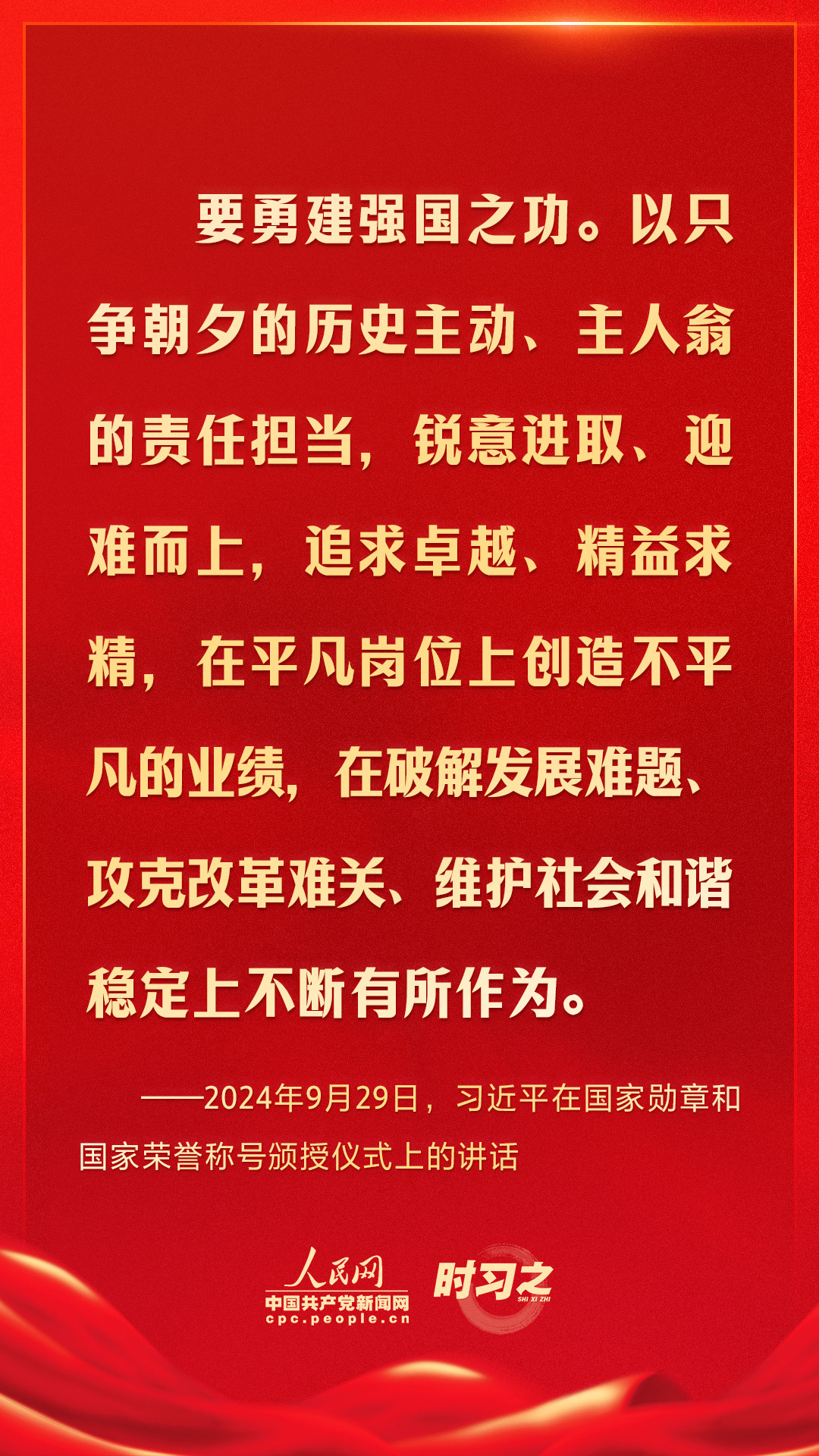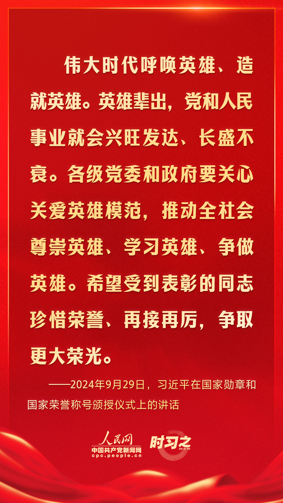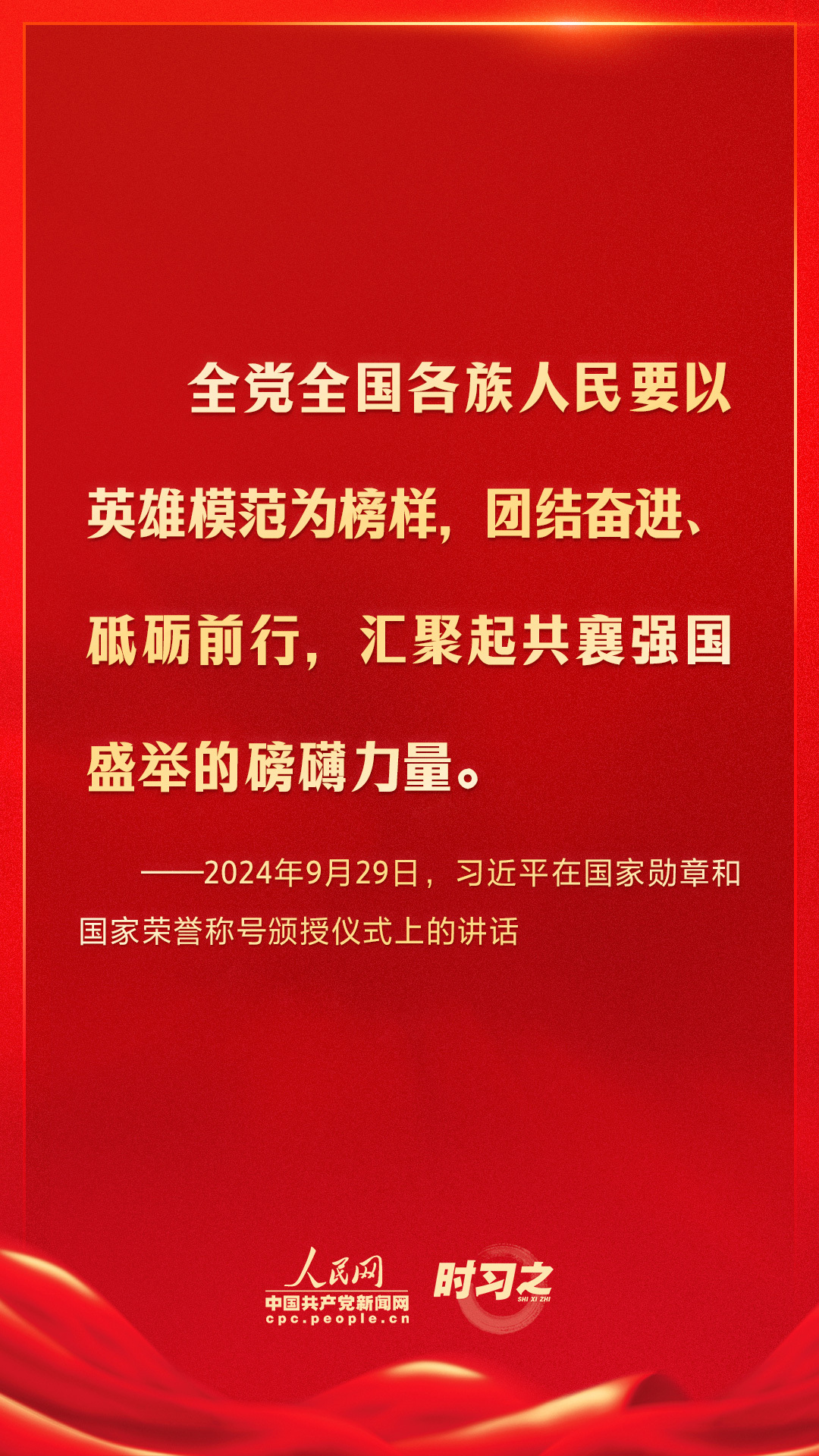 2024年9月29日上午,中華人民共和國國家勛章和國家榮譽稱號頒授儀式在北京人民大會堂金色大廳隆重舉行。中共中央總書記、國家主席、中央軍委主席習近平向國家勛章和國家榮譽稱號獲得者頒授勛章獎章并發表重要講話。