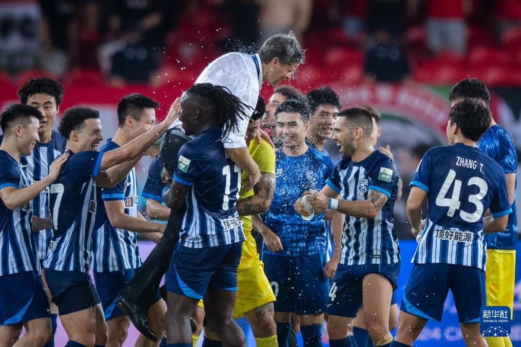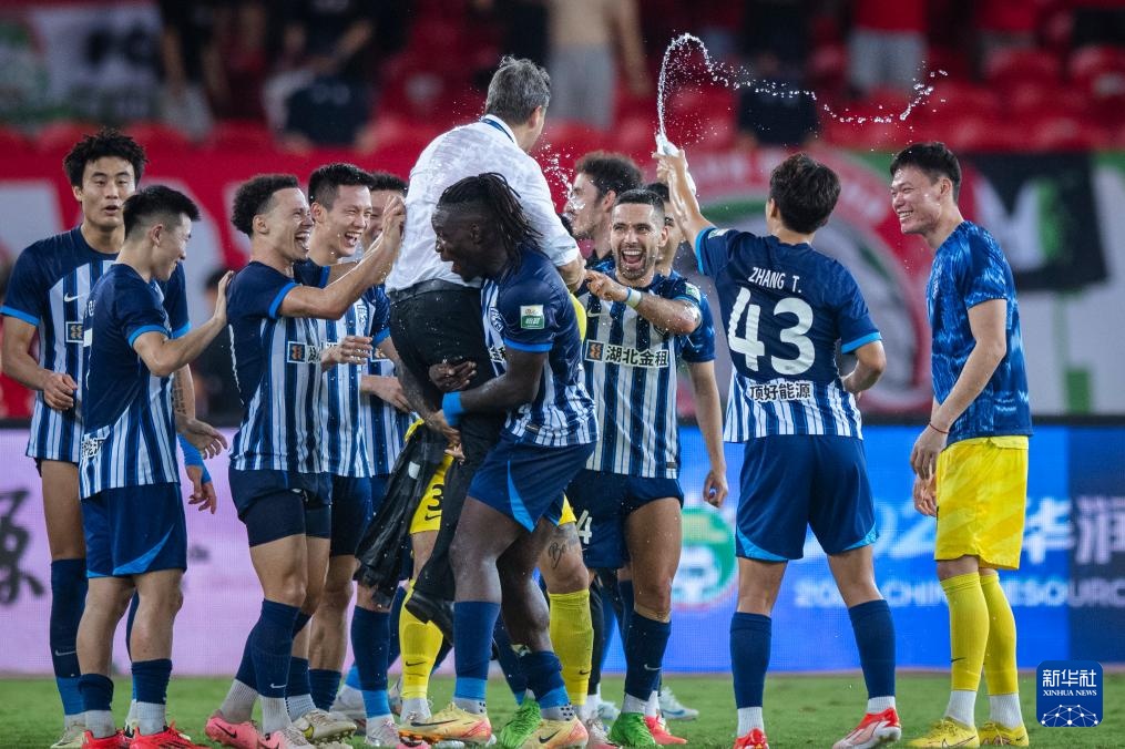 9月29日,武漢三鎮隊主教練里卡多(中上)賽后被隊員抱起慶祝。