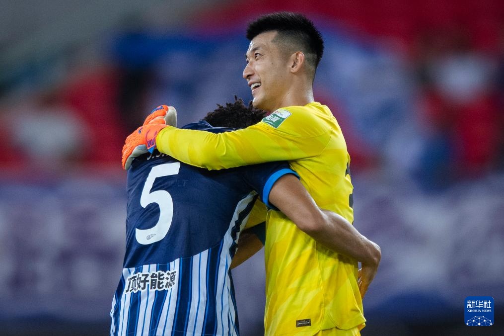 9月29日,武漢三鎮隊守門員劉殿座(右)和武漢三鎮隊球員樸志洙在比賽結束后慶祝。