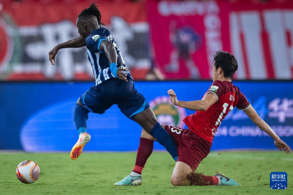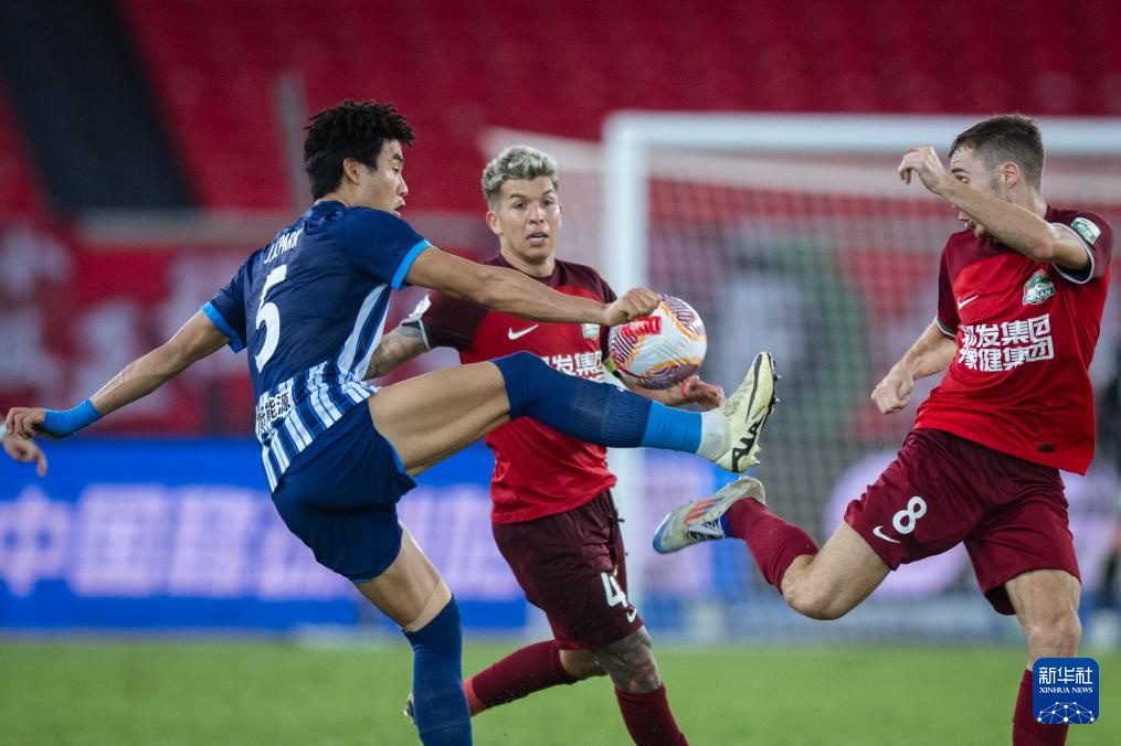 9月29日,武漢三鎮隊球員樸志洙(左)和河南俱樂部酒祖杜康隊球員德尼奇(右)在比賽中拼搶。