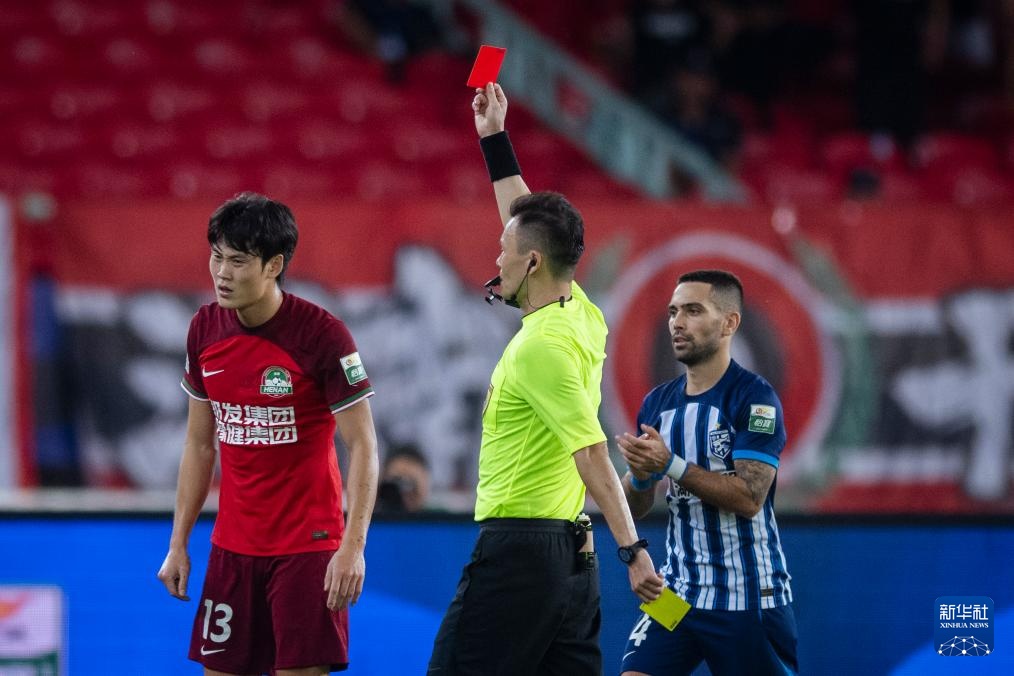 9月29日,主裁判張楊帆(中)在比賽中向河南俱樂部酒祖杜康隊球員徐浩峰(左)出示紅牌。