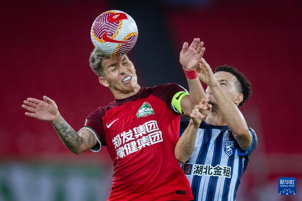 9月29日,河南俱樂部酒祖杜康隊球員納薩里奧(左)和武漢三鎮隊球員達蘭在比賽中爭頂。
