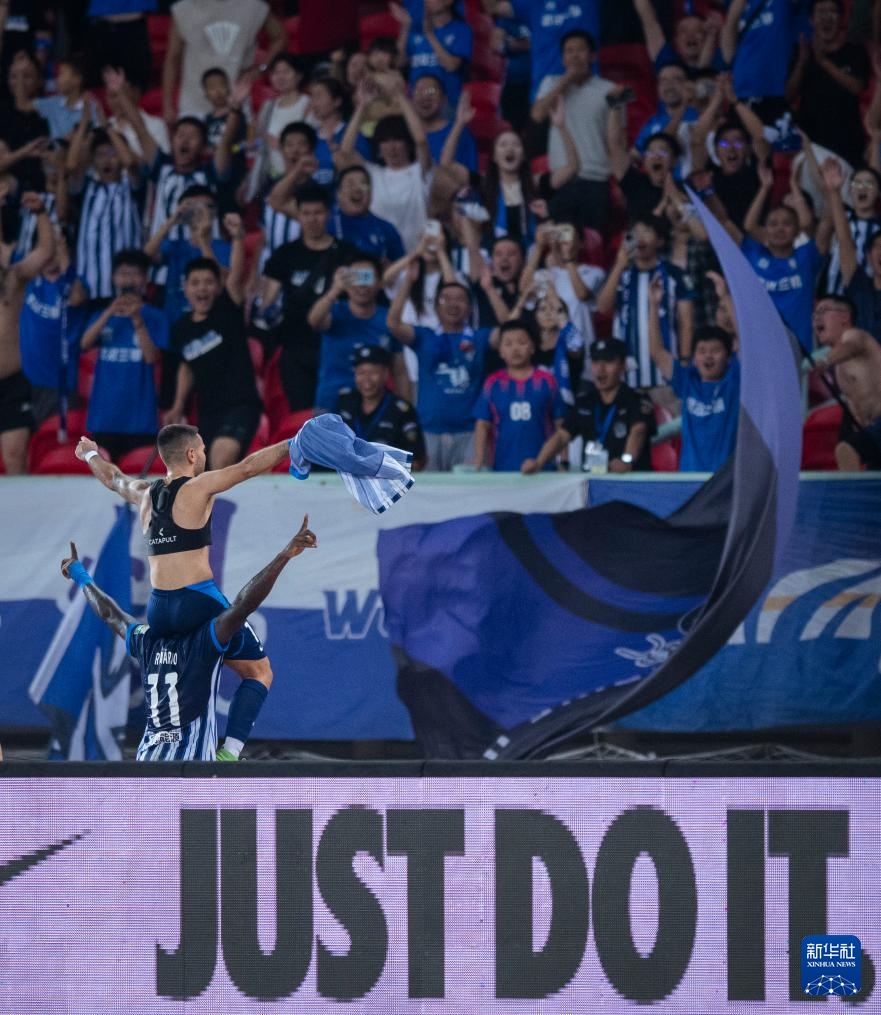 9月29日,武漢三鎮隊球員若卡(前上)在進球后慶祝。