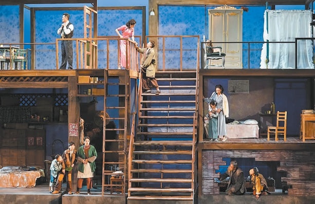 生動樸實的階層群像,是《烏鴉與麻雀》的一大看點,話劇對他們的塑造不限于軋金子、打麻將、搶盤尼西林等細膩熱絡的日常生活,也在舞臺空間中埋下種種暗喻,比如,公寓的布局設計耐人尋味,這是黃盈從電影中延續下來的靈感,高居頂樓的“烏鴉”、“雙腳離地”的知識分子、撐起社會基石的普通市民……房間的位置正是當時社會現實的寫照,在舞臺藝術中,階層間的壁壘與對比被格外立體地展現出來。