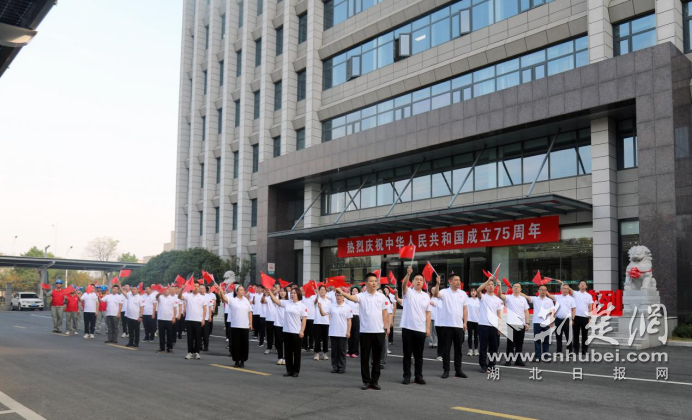 國旗高展迎風揚,舉國歡度國慶節(jié)。活動現(xiàn)場,五名護旗手邁著鏗鏘有力的步伐,莊重的將國旗護送至升旗臺。伴隨著《義勇軍進行曲》,鮮艷的五星紅旗迎風飛揚。全體人員整齊列隊,精神煥發(fā),懷著崇敬與激動的心情面向國旗行注目禮、唱國歌,伴隨著嘹亮的國歌聲,鮮艷的五星紅旗在辦公樓前冉冉升起,全體領導干部及員工整齊列隊,面對國旗行注目禮。